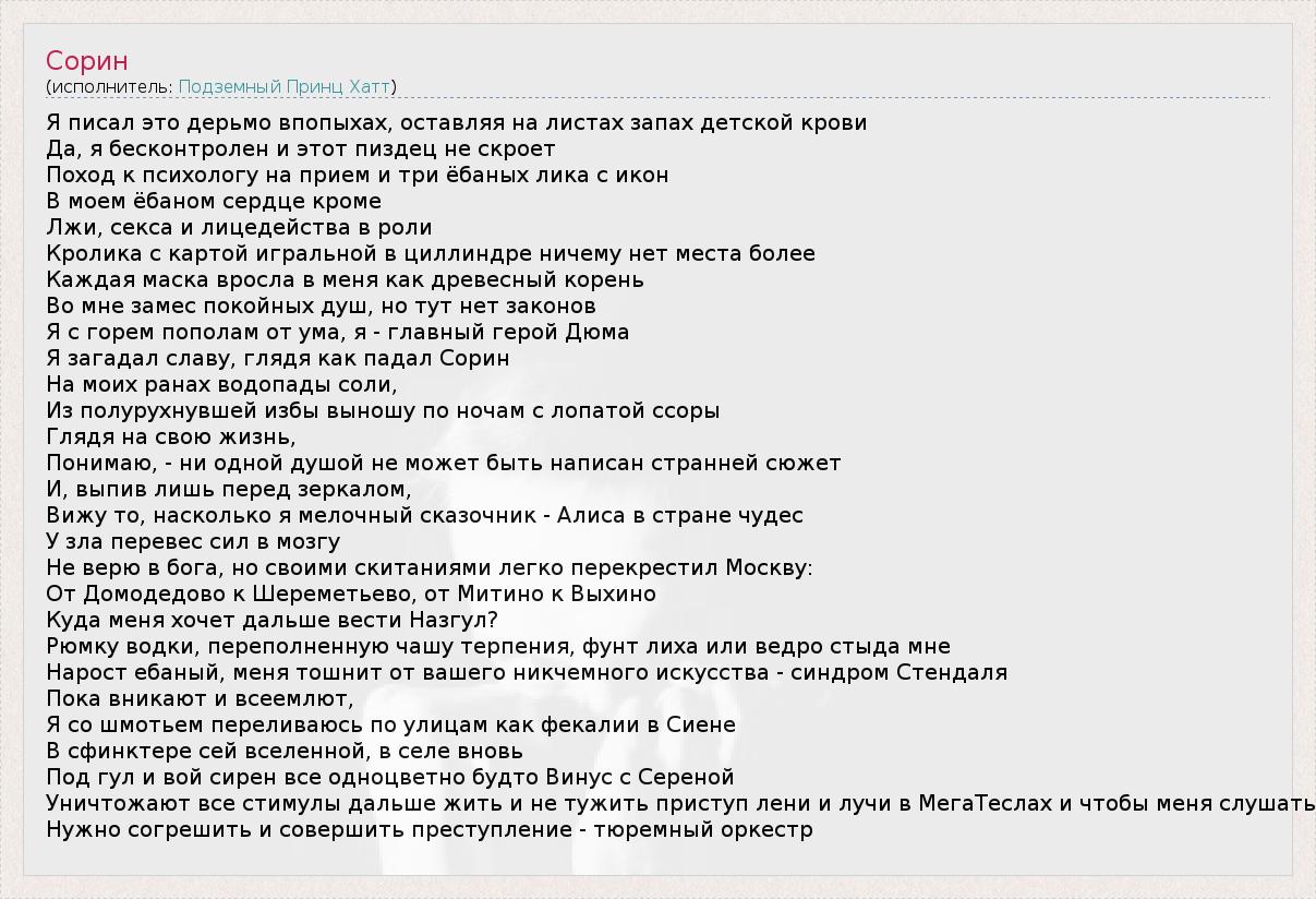 Я писал это дерьмо впопыхах, оставляя на листах запах детской крови Да, я бесконтролен и этот пиздец не скроет Поход к психологу на прием и три ёбаных лика с икон В моем ёбаном сердце кроме Лжи, секса и лицедейства в роли Кролика с картой игральной в циллиндре ничему нет места более Каждая маска вросла в меня как древесный корень Во мне замес покойных душ, но тут нет законов Я с горем пополам от ума, я - главный герой Дюма Я загадал славу, глядя как падал Сорин На моих ранах водопады соли, Из полурухнувшей избы выношу по ночам с лопатой ссоры Глядя на свою жизнь, Понимаю, - ни одной душой не может быть написан странней сюжет И, выпив лишь перед зеркалом, Вижу то, насколько я мелочный сказочник - Алиса в стране чудес У зла перевес сил в мозгу Не верю в бога, но своими скитаниями легко перекрестил Москву: От Домодедово к Шереметьево, от Митино к Выхино Куда меня хочет дальше вести Назгул? Рюмку водки, переполненную чашу терпения, фунт лиха или ведро стыда мне Нарост ебаный, меня тошнит от вашего никчемного искусства - синдром Стендаля Пока вникают и всеемлют, Я со шмотьем переливаюсь по улицам как фекалии в Сиене В сфинктере сей вселенной, в селе вновь Под гул и вой сирен все одноцветно будто Винус с Сереной Уничтожают все стимулы дальше жить и не тужить приступ лени и лучи в МегаТеслах и чтобы меня слушать Нужно согрешить и совершить преступление - тюремный оркестр