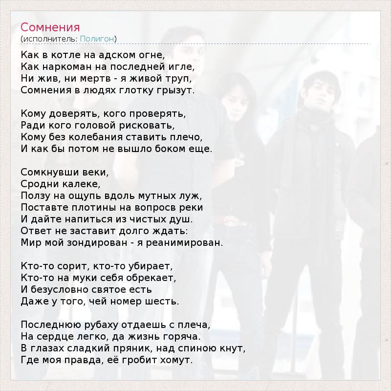 Это интересно:Группа «Полигон» – результат синтеза тяжелого гитарного звучания, мелодичности скрипки и осмысленных текстов. Именно тексты – идейная основа творчества (диалог с самим собой о внутренних противоречиях, высказывание своей жизненной и гражданской позиции – основная тематика песен).Участники никак не определяют музыкальный стиль коллектива. Определенный колорит вносит многофункциональность... продолжение