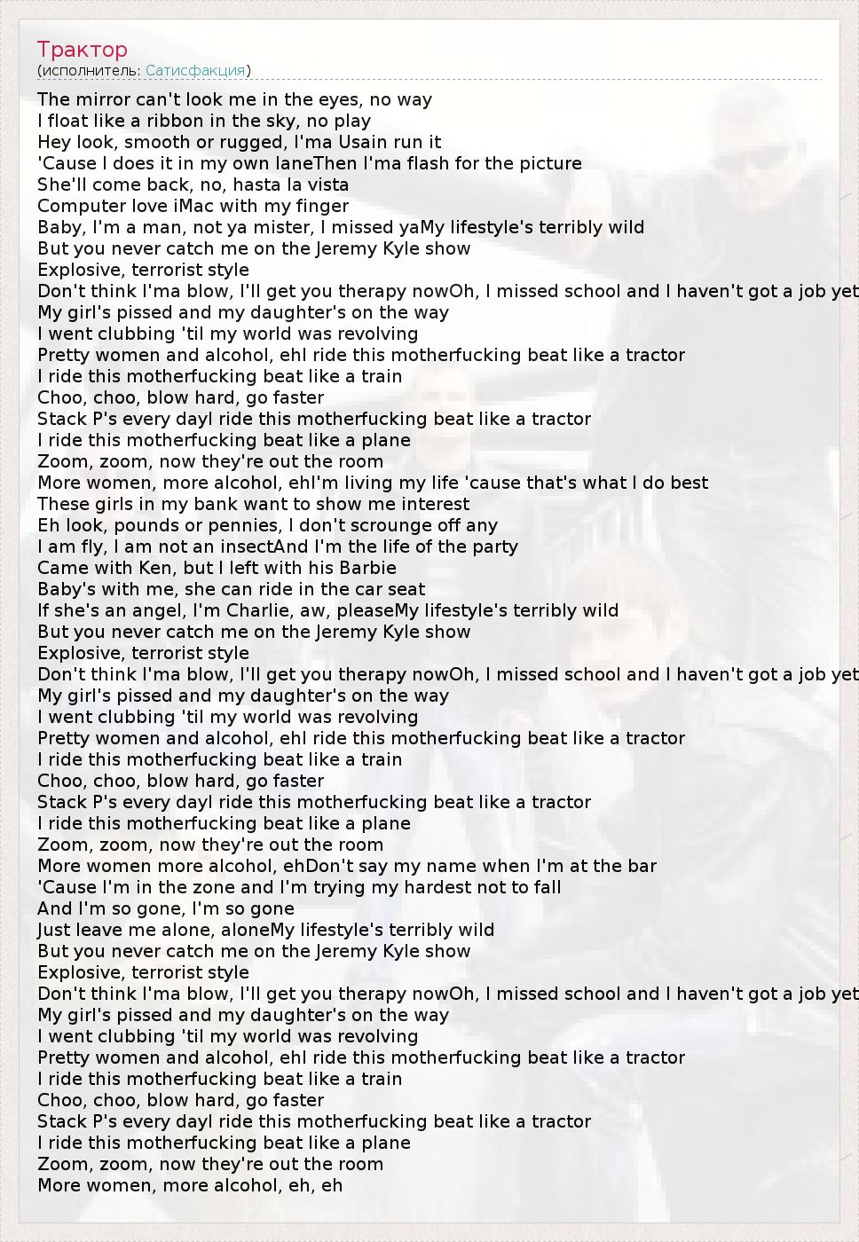 Pretty women and alcohol, ehI ride this motherfucking beat like a tractor