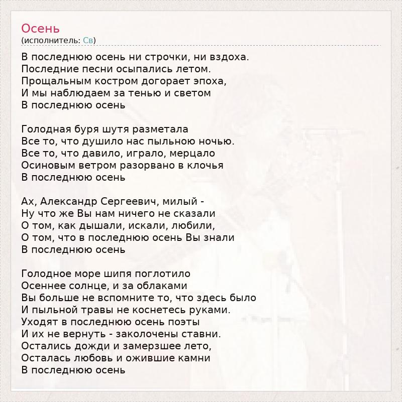 В последнюю осень ни строчки, ни вздоха. Последние песни осыпались летом. Прощальным костром догорает эпоха, И мы наблюдаем за тенью и светом В последнюю осень Голодная буря шутя разметала Все то, что душило нас пыльною ночью. Все то, что давило, играло, мерцало Осиновым ветром разорвано в клочья В последнюю осень Ах, Александр Сергеевич, милый - Ну что же Вы нам ничего не сказали О том, как дышали, искали, любили, О том, что в последнюю осень Вы знали В последнюю осень Голодное море шипя поглотило Осеннее солнце, и за облаками Вы больше не вспомните то, что здесь было И пыльной травы не коснетесь руками. Уходят в последнюю осень поэты И их не вернуть - заколочены ставни. Остались дожди и замерзшее лето, Осталась любовь и ожившие камни В последнюю осень
