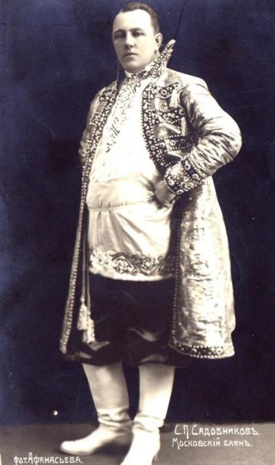 Это интересно: Семен Павлович Садовников - певец, автор песен начала 20-го века. И вот на сцену, встреченный аплодисментами, вышел владелец Говорушки — «Сеня Садовников», как звала его вся Москва. На нем был кафтан, весь зашитый камнями, с высоким воротом, глубокая шелковая рубаха, подпоясанная шелковым же голубым шнурком, красные высокие сафьяновые сапоги — словом, какая-то амальгама из боярского... продолжение
