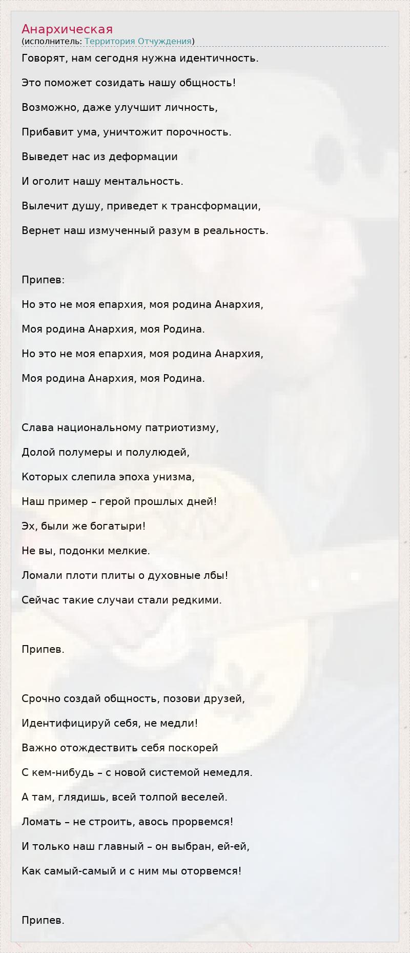 Говорят, нам сегодня нужна идентичность. Это поможет созидать нашу общность! Возможно, даже улучшит личность, Прибавит ума, уничтожит порочность. Выведет нас из деформации И оголит нашу ментальность. Вылечит душу, приведет к трансформации, Вернет наш измученный разум в реальность. Припев: Но это не моя епархия, моя родина Анархия, Моя родина Анархия, моя Родина. Но это не моя епархия, моя родина Анархия, Моя родина Анархия, моя Родина. Слава национальному патриотизму, Долой полумеры и полулюдей, Которых слепила эпоха унизма, Наш пример – герой прошлых дней! Эх, были же богатыри! Не вы, подонки мелкие. Ломали плоти плиты о духовные лбы! Сейчас такие случаи стали редкими. Припев. Срочно создай общность, позови друзей, Идентифицируй себя, не медли! Важно отождествить себя поскорей С кем-нибудь – с новой системой немедля. А там, глядишь, всей толпой веселей. Ломать – не строить, авось прорвемся! И только наш главный – он выбран, ей-ей, Как самый-самый и с ним мы оторвемся! Припев.