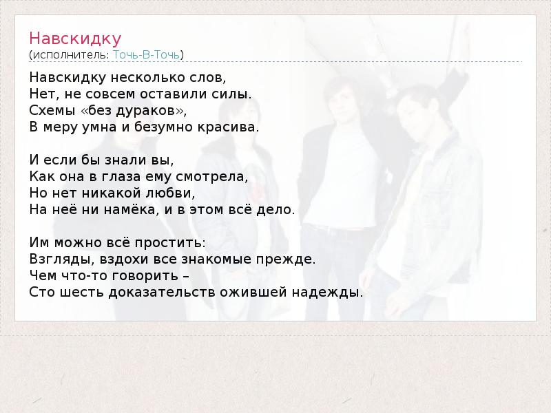 Сохранив свою близость к океану, не обремененные “заморочками” мегаполиса, они играют рок на русском, английском и испанском совсем, к счастью, не "по-русски", и позволяют себе иногда посмеиваться над слишком серьезным отношением к себе молодых жителей, а в большинстве своём, молодых жительниц большого города. Мелодичные песни «Точь-в-Точь» сглаживают колкости и крайности, и голос фронт-мена Ивана Волкова уводит от периодических, казалось бы, противоречий, и слушается группа едино и вкусно!