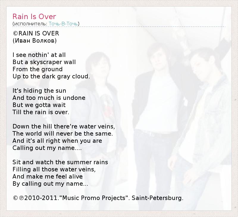 ©RAIN IS OVER (Иван Волков) I see nothin' at all But a skyscraper wall From the ground Up to the dark gray cloud. It's hiding the sun And too much is undone But we gotta wait Till the rain is over. Down the hill there're water veins, The world will never be the same. And it's all right when you are Calling out my name.... Sit and watch the summer rains Filling all those water veins, And make me feel alive By calling out my name... ©℗2010-2011."Music Promo Projects". Saint-Petersburg.