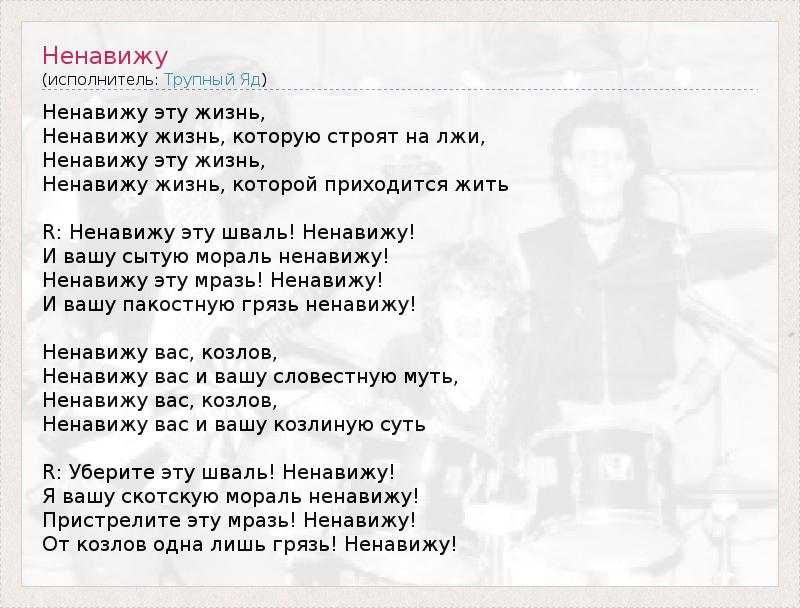 Ненавижу эту жизнь, Ненавижу жизнь, которую строят на лжи, Ненавижу эту жизнь, Ненавижу жизнь, которой приходится жить R: Ненавижу эту шваль! Ненавижу! И вашу сытую мораль ненавижу! Ненавижу эту мразь! Ненавижу! И вашу пакостную грязь ненавижу! Ненавижу вас, козлов, Ненавижу вас и вашу словестную муть, Ненавижу вас, козлов, Ненавижу вас и вашу козлиную суть R: Уберите эту шваль! Ненавижу! Я вашу скотскую мораль ненавижу! Пристрелите эту мразь! Ненавижу! От козлов одна лишь грязь! Ненавижу!