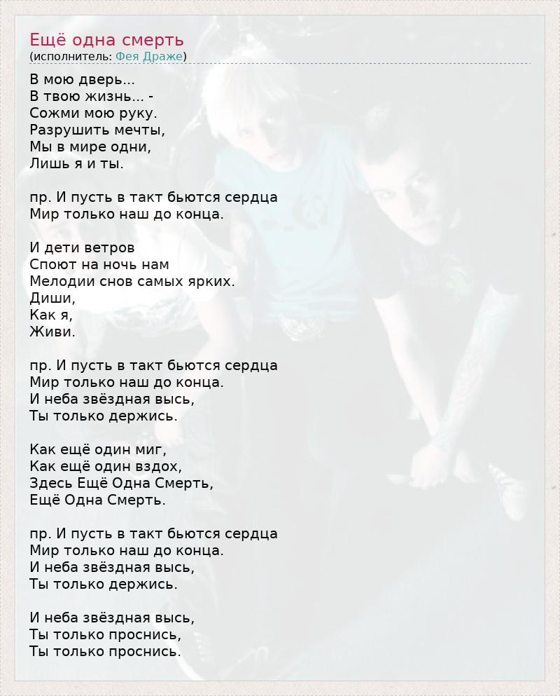 В мою дверь... В твою жизнь... - Сожми мою руку. Разрушить мечты, Мы в мире одни, Лишь я и ты. пр. И пусть в такт бьются сердца Мир только наш до конца. И дети ветров Споют на ночь нам Мелодии снов самых ярких. Диши, Как я, Живи. пр. И пусть в такт бьются сердца Мир только наш до конца. И неба звёздная высь, Ты только держись. Как ещё один миг, Как ещё один вздох, Здесь Ещё Одна Смерть, Ещё Одна Смерть. пр. И пусть в такт бьются сердца Мир только наш до конца. И неба звёздная высь, Ты только держись. И неба звёздная высь, Ты только проснись, Ты только проснись.