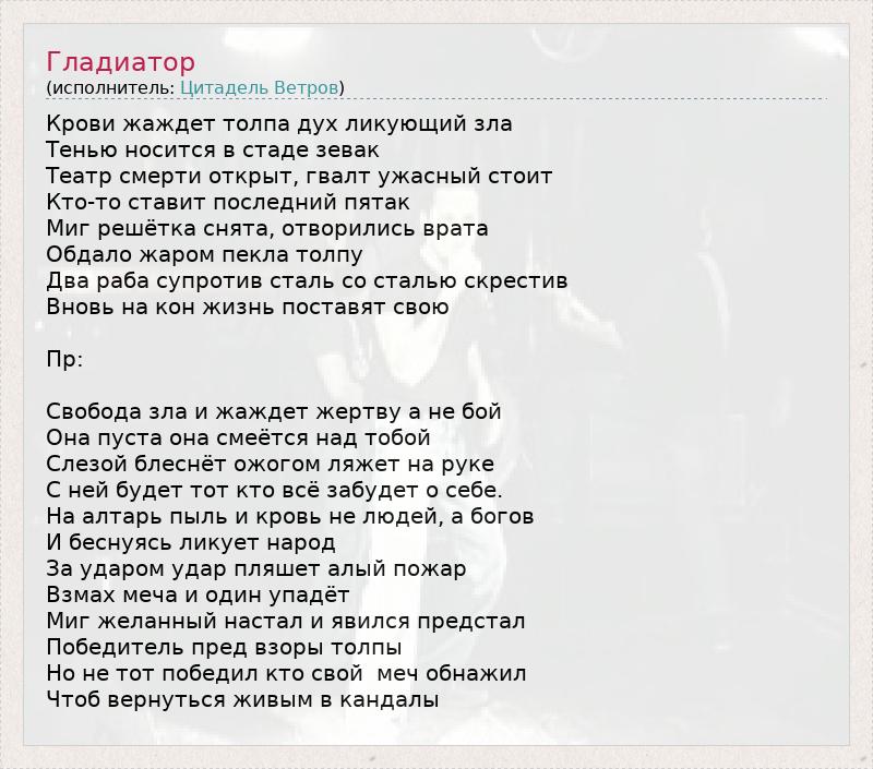 Крови жаждет толпа дух ликующий зла Тенью носится в стаде зевак Театр смерти открыт, гвалт ужасный стоит Кто-то ставит последний пятак Миг решётка снята, отворились врата Обдало жаром пекла толпу Два раба супротив сталь со сталью скрестив Вновь на кон жизнь поставят свою Пр: Свобода зла и жаждет жертву а не бой Она пуста она смеётся над тобой Слезой блеснёт ожогом ляжет на руке С ней будет тот кто всё забудет о себе. На алтарь пыль и кровь не людей, а богов И беснуясь ликует народ За ударом удар пляшет алый пожар Взмах меча и один упадёт Миг желанный настал и явился предстал Победитель пред взоры толпы Но не тот победил кто свой меч обнажил Чтоб вернуться живым в кандалы