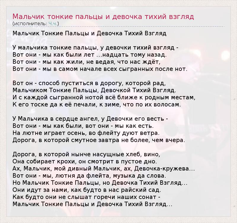 Мальчик Тонкие Пальцы и Девочка Тихий Взгляд У мальчика тонкие пальцы, у девочки тихий взгляд - Вот они - мы как были лет …надцать тому назад. Вот они - мы как жили, не ведая, что нас ждёт, Вот они - мы в самом начале всех сыгранных после нот. Вот он - способ пуститься в дорогу, которой рад, Мальчиком Тонкие Пальцы, Девочкой Тихий Взгляд. И с каждой сыгранной нотой всё ближе к родным местам, К его тоске да к её печали, к зиме, что по их волосам. У Мальчика в сердце ангел, у Девочки его весть - Вот они - мы как были, вот они - мы как есть. На лютне играет осень, во флейту дуют ветра. Дорога, в которой смутное завтра не более, чем вчера. Дорога, в которой нынче насущные хлеб, вино, Она собирает крохи, он смотрит в пустое дно. Ах, Мальчик, мой дивный Мальчик, ах, Девочка-кружева… Вот они - мы, лютня да флейта, музыка да слова. Но Мальчик Тонкие Пальцы, но Девочка Тихий Взгляд… Они идут за нами, как будто в нас райский сад. Как будто они не слышат горечи наших сонат - Мальчик Тонкие Пальцы и Девочка Тихий Взгляд…