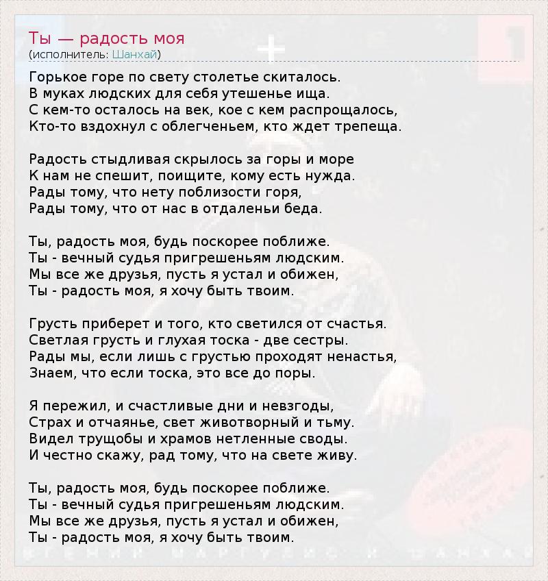 Горькое горе по свету столетье скиталось. В муках людских для себя утешенье ища. С кем-то осталось на век, кое с кем распрощалось, Кто-то вздохнул с облегченьем, кто ждет трепеща. Радость стыдливая скрылось за горы и море К нам не спешит, поищите, кому есть нужда. Рады тому, что нету поблизости горя, Рады тому, что от нас в отдаленьи беда. Ты, радость моя, будь поскорее поближе. Ты - вечный судья пригрешеньям людским. Мы все же друзья, пусть я устал и обижен, Ты - радость моя, я хочу быть твоим. Грусть приберет и того, кто светился от счастья. Светлая грусть и глухая тоска - две сестры. Рады мы, если лишь с грустью проходят ненастья, Знаем, что если тоска, это все до поры. Я пережил, и счастливые дни и невзгоды, Страх и отчаянье, свет животворный и тьму. Видел трущобы и храмов нетленные своды. И честно скажу, рад тому, что на свете живу. Ты, радость моя, будь поскорее поближе. Ты - вечный судья пригрешеньям людским. Мы все же друзья, пусть я устал и обижен, Ты - радость моя, я хочу быть твоим.