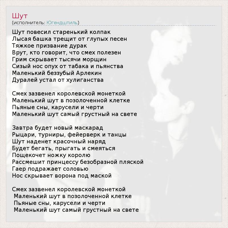 Шут повесил старенький колпак Лысая башка трещит от глупых песен Тяжкое призвание дурак Врут, кто говорит, что смех полезен Грим скрывает тысячи морщин Сизый нос опух от табака и пьянства Маленький беззубый Арлекин Дуралей устал от хулиганства Смех зазвенел королевской монеткой Маленький шут в позолоченной клетке Пьяные сны, карусели и черти Маленький шут самый грустный на свете Завтра будет новый маскарад Рыцари, турниры, фейерверк и танцы Шут наденет красочный наряд Будет бегать, прыгать и смеяться Пощекочет ножку королю Рассмешит принцессу безобразной пляской Гаер подражает соловью Нос скрывает ворона под маской Смех зазвенел королевской монеткой Маленький шут в позолоченной клетке Пьяные сны, карусели и черти Маленький шут самый грустный на свете