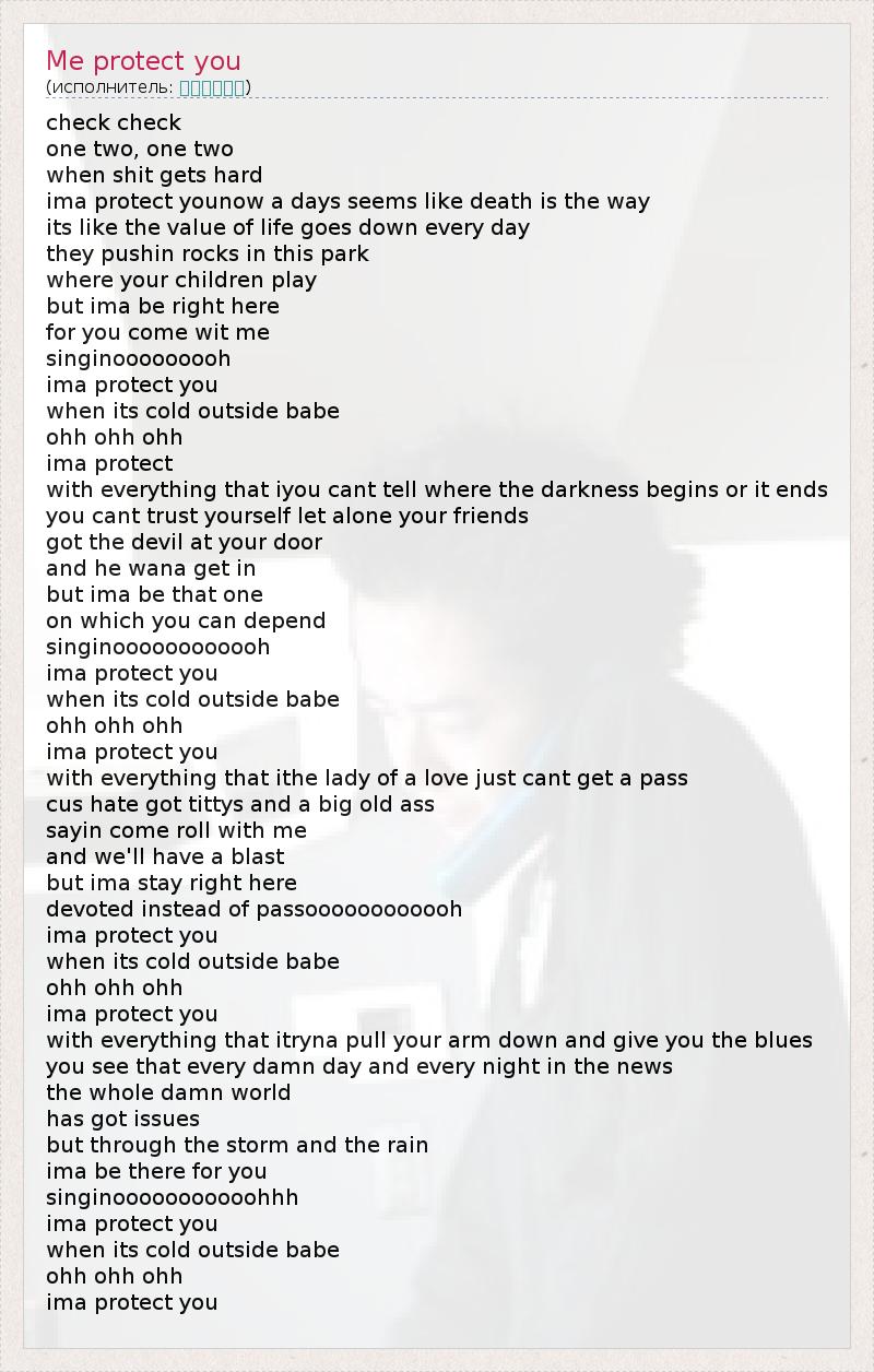 check check one two, one two when shit gets hard ima protect younow a days seems like death is the way its like the value of life goes down every day they pushin rocks in this park where your children play but ima be right here for you come wit me singinooooooooh ima protect you when its cold outside babe ohh ohh ohh ima protect with everything that iyou cant tell where the darkness begins or it ends you cant trust yourself let alone your friends got the devil at your door and he wana get in but ima be that one on which you can depend singinoooooooooooh ima protect you when its cold outside babe ohh ohh ohh ima protect you with everything that ithe lady of a love just cant get a pass cus hate got tittys and a big old ass sayin come roll with me and we'll have a blast but ima stay right here devoted instead of passoooooooooooh ima protect you when its cold outside babe ohh ohh ohh ima protect you with everything that itryna pull your arm down and give you the blues you see that every damn day and every night in the news the whole damn world has got issues but through the storm and the rain ima be there for you singinooooooooooohhh ima protect you when its cold outside babe ohh ohh ohh ima protect you