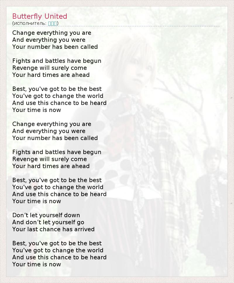 Измени всё в себе И всё, чем ты был... Твой номер назвали... Начались сражения и битвы, Месть наверняка настигнет тебя: Впереди у тебя трудные времена... Лучшим, ты должен быть лучшим, Ты должен изменить мир И использовать этот шанс быть услышанным... Твоё время настало... Измени всё в себе И всё, чем ты был... Твой номер назвали... Начались сражения и битвы, Месть наверняка настигнет тебя: Впереди у тебя трудные времена... Лучшим, ты должен быть лучшим, Ты должен изменить мир И использовать этот шанс быть услышанным... Твоё время настало... Не урони честь И не пускайся во все тяжкие, Это твой последний шанс... Лучшим, ты должен быть лучшим, Ты должен изменить мир И использовать этот шанс быть услышанным... Твоё время настало...