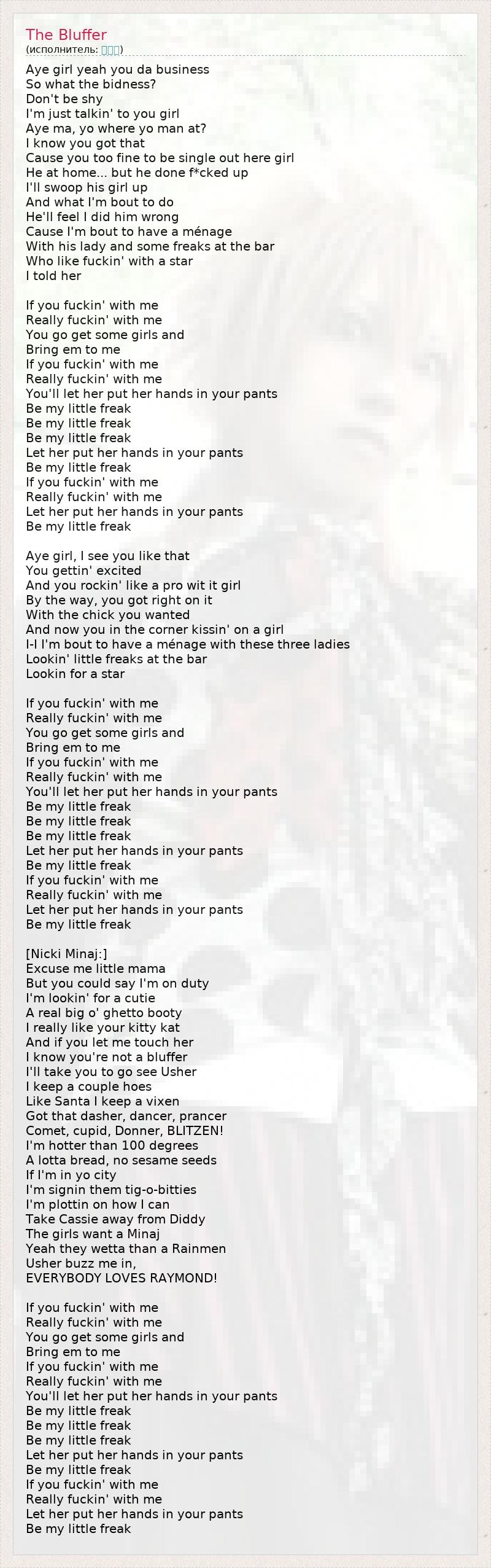Aye girl yeah you da business So what the bidness? Don't be shy I'm just talkin' to you girl Aye ma, yo where yo man at? I know you got that Cause you too fine to be single out here girl He at home... but he done f*cked up I'll swoop his girl up And what I'm bout to do He'll feel I did him wrong Cause I'm bout to have a ménage With his lady and some freaks at the bar Who like fuckin' with a star I told her If you fuckin' with me Really fuckin' with me You go get some girls and Bring em to me If you fuckin' with me Really fuckin' with me You'll let her put her hands in your pants Be my little freak Be my little freak Be my little freak Let her put her hands in your pants Be my little freak If you fuckin' with me Really fuckin' with me Let her put her hands in your pants Be my little freak Aye girl, I see you like that You gettin' excited And you rockin' like a pro wit it girl By the way, you got right on it With the chick you wanted And now you in the corner kissin' on a girl I-I I'm bout to have a ménage with these three ladies Lookin' little freaks at the bar Lookin for a star If you fuckin' with me Really fuckin' with me You go get some girls and Bring em to me If you fuckin' with me Really fuckin' with me You'll let her put her hands in your pants Be my little freak Be my little freak Be my little freak Let her put her hands in your pants Be my little freak If you fuckin' with me Really fuckin' with me Let her put her hands in your pants Be my little freak [Nicki Minaj:] Excuse me little mama But you could say I'm on duty I'm lookin' for a cutie A real big o' ghetto booty I really like your kitty kat And if you let me touch her I know you're not a bluffer I'll take you to go see Usher I keep a couple hoes Like Santa I keep a vixen Got that dasher, dancer, prancer Comet, cupid, Donner, BLITZEN! I'm hotter than 100 degrees A lotta bread, no sesame seeds If I'm in yo city I'm signin them tig-o-bitties I'm plottin on how I can Take Cassie away from Diddy The girls want a Minaj Yeah they wetta than a Rainmen Usher buzz me in, EVERYBODY LOVES RAYMOND! If you fuckin' with me Really fuckin' with me You go get some girls and Bring em to me If you fuckin' with me Really fuckin' with me You'll let her put her hands in your pants Be my little freak Be my little freak Be my little freak Let her put her hands in your pants Be my little freak If you fuckin' with me Really fuckin' with me Let her put her hands in your pants Be my little freak
