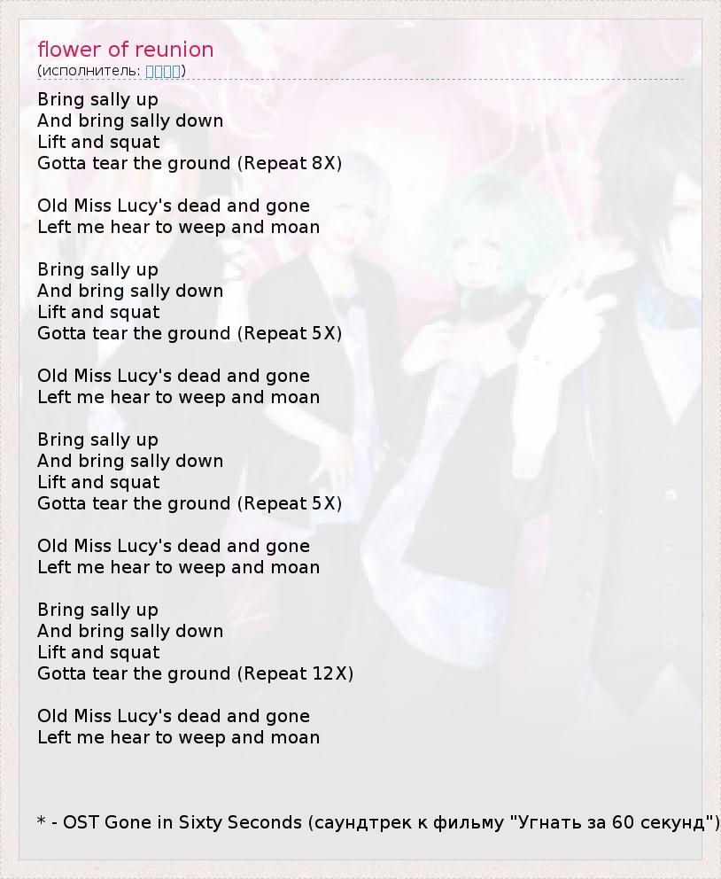 Bring sally up And bring sally down Lift and squat Gotta tear the ground (Repeat 8X) Old Miss Lucy's dead and gone Left me hear to weep and moan Bring sally up And bring sally down Lift and squat Gotta tear the ground (Repeat 5X) Old Miss Lucy's dead and gone Left me hear to weep and moan Bring sally up And bring sally down Lift and squat Gotta tear the ground (Repeat 5X) Old Miss Lucy's dead and gone Left me hear to weep and moan Bring sally up And bring sally down Lift and squat Gotta tear the ground (Repeat 12X) Old Miss Lucy's dead and gone Left me hear to weep and moan * - OST Gone in Sixty Seconds (cаундтрек к фильму "Угнать за 60 секунд")