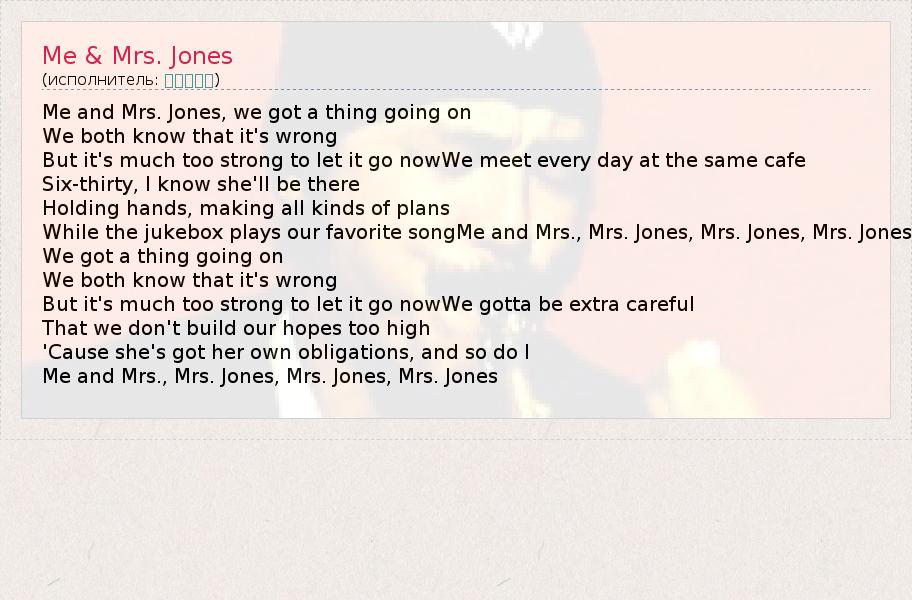 Me and Mrs. Jones, we got a thing going on We both know that it's wrong But it's much too strong to let it go nowWe meet every day at the same cafe Six-thirty, I know she'll be there Holding hands, making all kinds of plans While the jukebox plays our favorite songMe and Mrs., Mrs. Jones, Mrs. Jones, Mrs. Jones We got a thing going on We both know that it's wrong But it's much too strong to let it go nowWe gotta be extra careful That we don't build our hopes too high 'Cause she's got her own obligations, and so do I Me and Mrs., Mrs. Jones, Mrs. Jones, Mrs. Jones