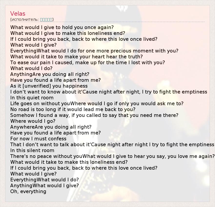 What would I give to hold you once again? What would I give to make this loneliness end? If I could bring you back, back to where this love once lived? What would I give? EverythingWhat would I do for one more precious moment with you? What would it take to make your heart hear the truth? To ease our pain I caused, make up for the time I lost with you? What would I do? AnythingAre you doing all right? Have you found a life apart from me? As it [unverified] you happiness I don't want to know about it'Cause night after night, I try to fight the emptiness In this quiet room Life goes on without youWhere would I go if only you would ask me to? No road is too long if it would lead me back to you? Somehow I found a way, if you called to say that you need me there? Where would I go? AnywhereAre you doing all right? Have you found a life apart from me? For now I must confess That I don't want to talk about it'Cause night after night I try to fight the emptiness In this silent room There's no peace without youWhat would I give to hear you say, you love me again? What would it take to make this loneliness end? If I could bring you back, back to where this love once lived? What would I give? EverythingWhat would I do? AnythingWhat would I give? Oh, everything