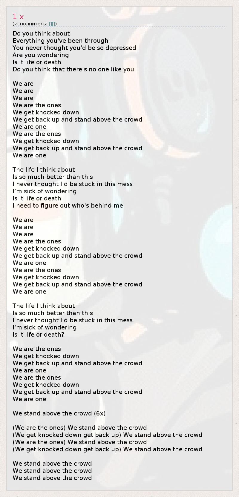 Do you think about Everything you've been through You never thought you'd be so depressed Are you wondering Is it life or death Do you think that there's no one like you We are We are We are We are the ones We get knocked down We get back up and stand above the crowd We are one We are the ones We get knocked down We get back up and stand above the crowd We are one The life I think about Is so much better than this I never thought I'd be stuck in this mess I'm sick of wondering Is it life or death I need to figure out who's behind me We are We are We are We are the ones We get knocked down We get back up and stand above the crowd We are one We are the ones We get knocked down We get back up and stand above the crowd We are one The life I think about Is so much better than this I never thought I'd be stuck in this mess I'm sick of wondering Is it life or death? We are the ones We get knocked down We get back up and stand above the crowd We are one We are the ones We get knocked down We get back up and stand above the crowd We are one We stand above the crowd (6x) (We are the ones) We stand above the crowd (We get knocked down get back up) We stand above the crowd (We are the ones) We stand above the crowd (We get knocked down get back up) We stand above the crowd We stand above the crowd We stand above the crowd We stand above the crowd