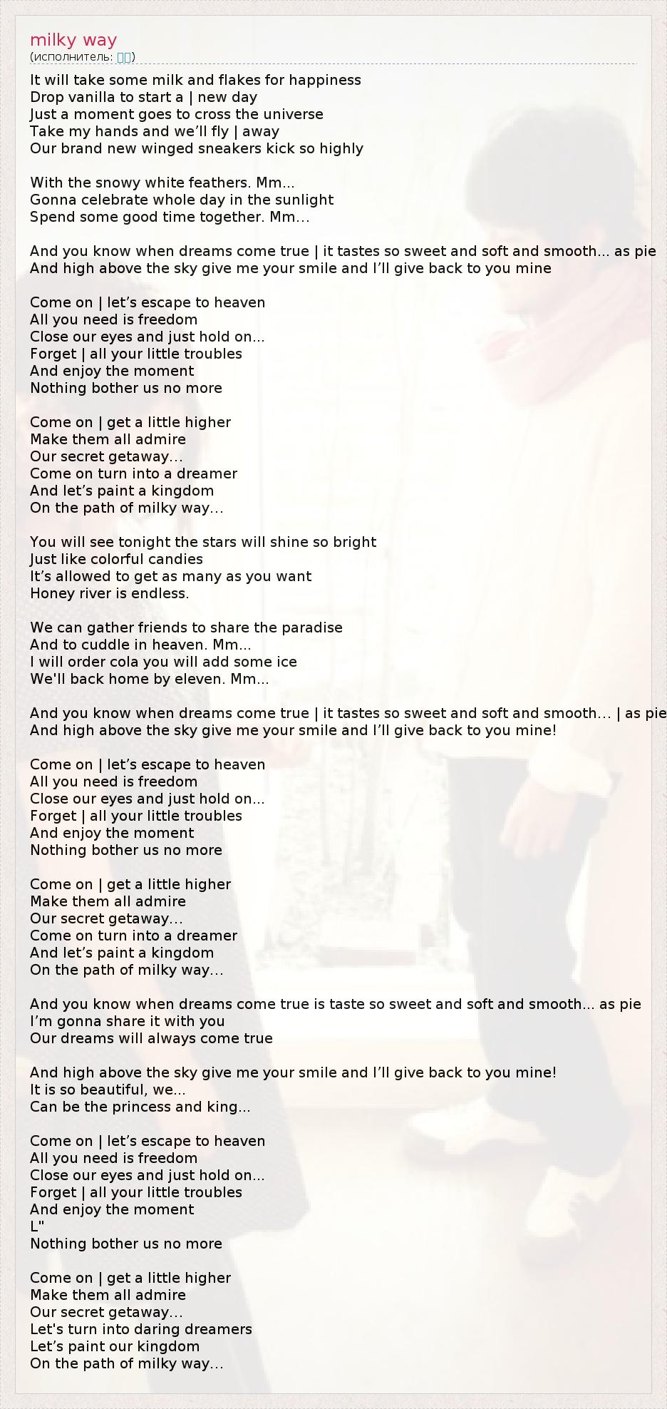 It will take some milk and flakes for happiness Drop vanilla to start a | new day Just a moment goes to cross the universe Take my hands and we’ll fly | away Our brand new winged sneakers kick so highly With the snowy white feathers. Mm... Gonna celebrate whole day in the sunlight Spend some good time together. Mm… And you know when dreams come true | it tastes so sweet and soft and smooth... as pie And high above the sky give me your smile and I’ll give back to you mine Come on | let’s escape to heaven All you need is freedom Сlose our eyes and just hold on... Forget | all your little troubles And enjoy the moment Nothing bother us no more Come on | get a little higher Make them all admire Our secret getaway… Come on turn into a dreamer And let’s paint a kingdom On the path of milky way… You will see tonight the stars will shine so bright Just like colorful candies It’s allowed to get as many as you want Honey river is endless. We can gather friends to share the paradise And to cuddle in heaven. Mm... I will order cola you will add some ice We'll back home by eleven. Mm... And you know when dreams come true | it tastes so sweet and soft and smooth… | as pie And high above the sky give me your smile and I’ll give back to you mine! Come on | let’s escape to heaven All you need is freedom Сlose our eyes and just hold on... Forget | all your little troubles And enjoy the moment Nothing bother us no more Come on | get a little higher Make them all admire Our secret getaway… Come on turn into a dreamer And let’s paint a kingdom On the path of milky way… And you know when dreams come true is taste so sweet and soft and smooth... as pie I’m gonna share it with you Our dreams will always come true And high above the sky give me your smile and I’ll give back to you mine! It is so beautiful, we... Can be the princess and king... Come on | let’s escape to heaven All you need is freedom Сlose our eyes and just hold on... Forget | all your little troubles And enjoy the moment L" Nothing bother us no more Come on | get a little higher Make them all admire Our secret getaway… Let's turn into daring dreamers Let’s paint our kingdom On the path of milky way…