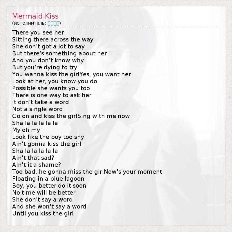 There you see her Sitting there across the way She don't got a lot to say But there's something about her And you don't know why But you're dying to try You wanna kiss the girlYes, you want her Look at her, you know you do Possible she wants you too There is one way to ask her It don't take a word Not a single word Go on and kiss the girlSing with me now Sha la la la la la My oh my Look like the boy too shy Ain't gonna kiss the girl Sha la la la la la Ain't that sad? Ain't it a shame? Too bad, he gonna miss the girlNow's your moment Floating in a blue lagoon Boy, you better do it soon No time will be better She don't say a word And she won't say a word Until you kiss the girl