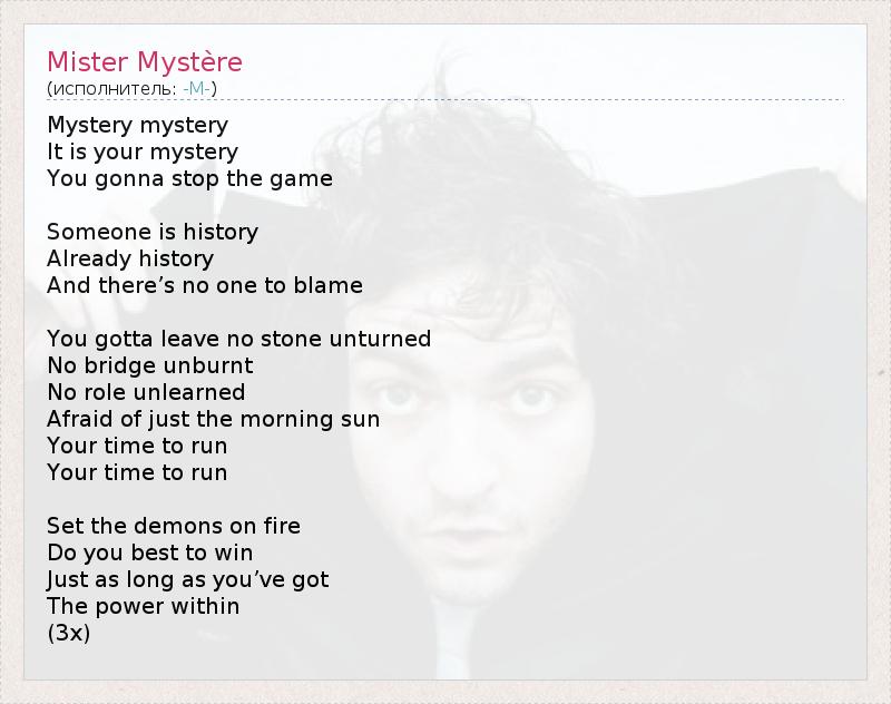 Mystery mystery It is your mystery You gonna stop the game Someone is history Already history And there’s no one to blame You gotta leave no stone unturned No bridge unburnt No role unlearned Afraid of just the morning sun Your time to run Your time to run Set the demons on fire Do you best to win Just as long as you’ve got The power within (3х)