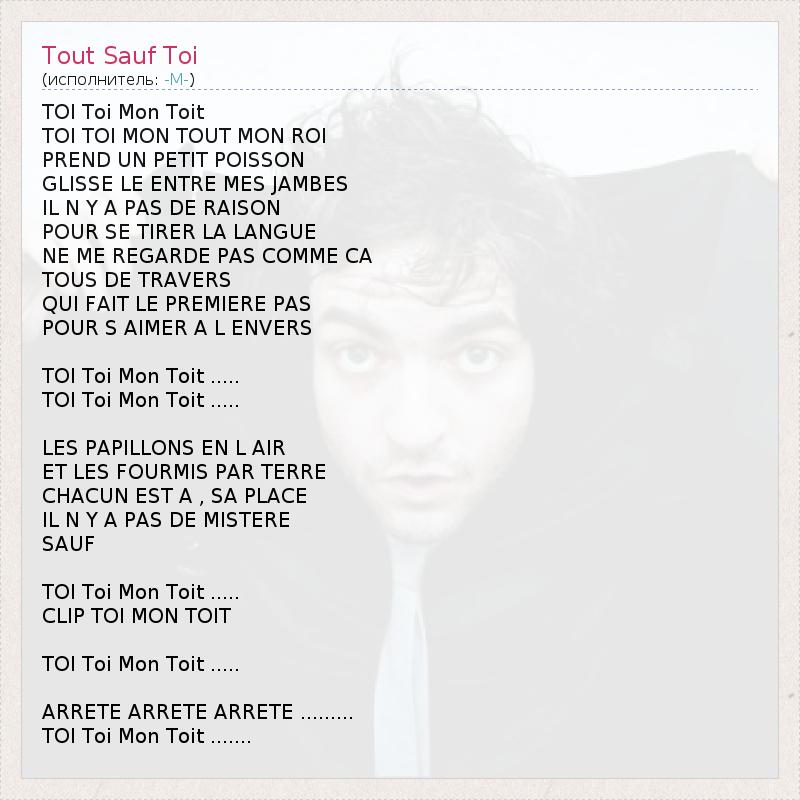 TOI Toi Mon Toit TOI TOI MON TOUT MON ROI PREND UN PETIT POISSON GLISSE LE ENTRE MES JAMBES IL N Y A PAS DE RAISON POUR SE TIRER LA LANGUE NE ME REGARDE PAS COMME CA TOUS DE TRAVERS QUI FAIT LE PREMIERE PAS POUR S AIMER A L ENVERS TOI Toi Mon Toit ..... TOI Toi Mon Toit ..... LES PAPILLONS EN L AIR ET LES FOURMIS PAR TERRE CHACUN EST A , SA PLACE IL N Y A PAS DE MISTERE SAUF TOI Toi Mon Toit ..... CLIP TOI MON TOIT TOI Toi Mon Toit ..... ARRETE ARRETE ARRETE ......... TOI Toi Mon Toit .......