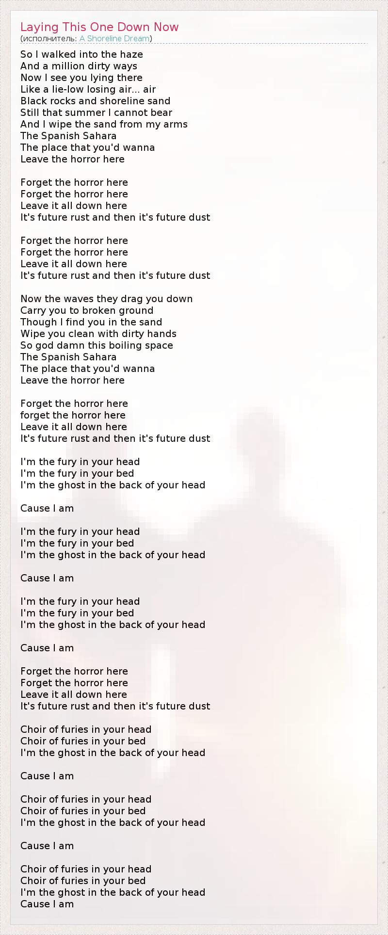 Я входил прямо в туман Миллионами грязных дорог. Теперь я вижу, ты лежишь там, Лежишь и задыхаешься от нехватки воздуха... воздуха. Вокруг черные скалы и песчаный берег. Я больше не могу выносить это лето, И я стряхиваю песок с моих рук Испанская Сахара - Место, где бы ты хотела Оставить свои страхи. Забудь все страхи тут. Забудь все страхи тут. Оставь все это здесь. Все это станет пылью. Забудь свои страхи тут. Забудь свои страхи тут. Оставь все это здесь. Все это станет пылью. А прибой тянет тебя назад, Возвращает обратно на берег, Где я нашел тебя в песках. Вытру тебя своими грязными руками, Но воздух так чертовски раскален. Испанская Сахара - Место, где бы ты хотела Оставить свои страхи. Забудь свои страхи тут. Забудь свои страхи тут. Оставь все это здесь. Все это станет пылью. Я безумие в твоей голове, Я фурия в твоем ложе, Я тень внутри тебя. Ведь я... Я безумие в твоей голове, Я фурия в твоем ложе, Я тень внутри тебя. Ведь я... Я безумие в твоей голове, Я фурия в твоем ложе, Я тень внутри тебя. Ведь я... Забудь свои страхи тут. Забудь свои страхи тут. Оставь все это здесь. Все это осядет как пыль. Адские голоса в твоей голове, Хор фурий в твоем ложе, Я тень внутри тебя. Ведь я... Адские голоса в твоей голове, Хор фурий в твоем ложе, Я тень внутри тебя. Ведь я... Адские голоса в твоей голове, Хор фурий в твоем ложе, Я тень внутри тебя. Ведь я...
