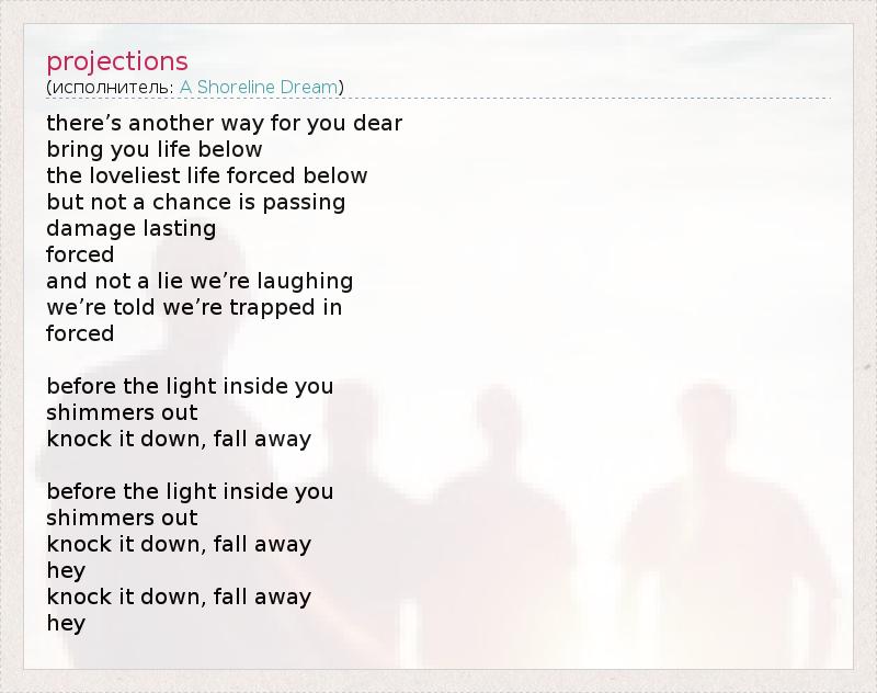 there’s another way for you dear bring you life below the loveliest life forced below but not a chance is passing damage lasting forced and not a lie we’re laughing we’re told we’re trapped in forced before the light inside you shimmers out knock it down, fall away before the light inside you shimmers out knock it down, fall away hey knock it down, fall away hey