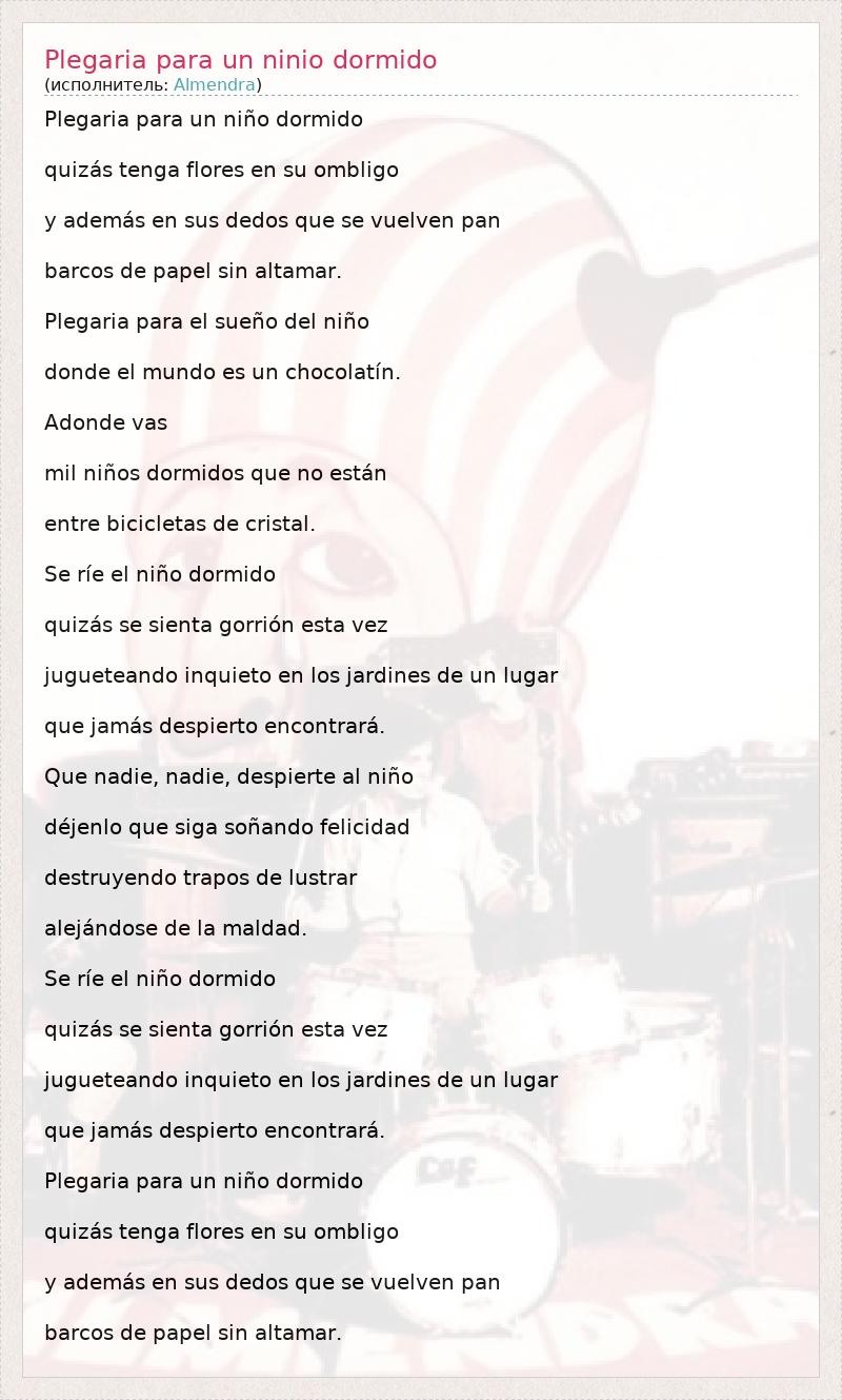 Plegaria para un niño dormido quizás tenga flores en su ombligo y además en sus dedos que se vuelven pan barcos de papel sin altamar. Plegaria para el sueño del niño donde el mundo es un chocolatín. Adonde vas mil niños dormidos que no están entre bicicletas de cristal. Se ríe el niño dormido quizás se sienta gorrión esta vez jugueteando inquieto en los jardines de un lugar que jamás despierto encontrará. Que nadie, nadie, despierte al niño déjenlo que siga soñando felicidad destruyendo trapos de lustrar alejándose de la maldad. Se ríe el niño dormido quizás se sienta gorrión esta vez jugueteando inquieto en los jardines de un lugar que jamás despierto encontrará. Plegaria para un niño dormido quizás tenga flores en su ombligo y además en sus dedos que se vuelven pan barcos de papel sin altamar.