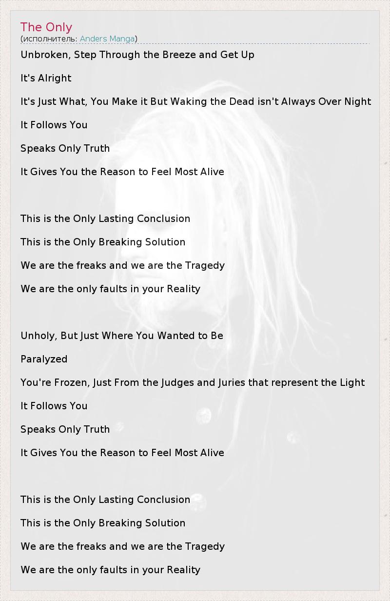 Unbroken, Step Through the Breeze and Get Up It's Alright It's Just What, You Make it But Waking the Dead isn't Always Over Night It Follows You Speaks Only Truth It Gives You the Reason to Feel Most Alive This is the Only Lasting Conclusion This is the Only Breaking Solution We are the freaks and we are the Tragedy We are the only faults in your Reality Unholy, But Just Where You Wanted to Be Paralyzed You're Frozen, Just From the Judges and Juries that represent the Light It Follows You Speaks Only Truth It Gives You the Reason to Feel Most Alive This is the Only Lasting Conclusion This is the Only Breaking Solution We are the freaks and we are the Tragedy We are the only faults in your Reality