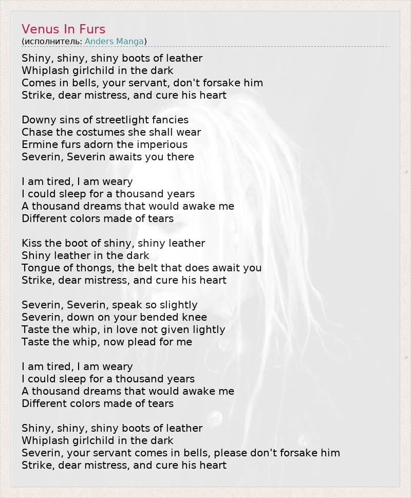 Ботинки из сияющей кожи, Отхлестай девочку в темноте. Со звоном приходит твой слуга - не прогоняй его; Ударь, госпожа, исцели его сердце. Греховные мечтания уличных фонарей... Отбрось в сторону костюм, который она должна была надеть. Властность в наряде из мехов горностая - Северин, Северин ждет тебя там. Я устал, я утомлен, Я бы мог проспать тысячу лет... Тысячи снов - кто бы разбудил меня? Тысячи цветов, переливающихся, словно слезы. Сияющие кожаные ботинки, Кожа, сверкающая в темноте, Язык ожидающего тебя кнута... Ударь, госпожа, исцели его сердце. Северин, Северин, ты так немногословен... На колени, Северин! Испытай кнут, любимый, Испытай кнут, умоляй меня... Я устал, я утомлен, Я бы мог проспать тысячу лет... Тысячи снов - кто бы разбудил меня? Тысячи цветов, переливающихся, словно слезы. Ботинки из сияющей кожи, Отхлестай девочку в темноте. Со звоном приходит твой слуга, Северин - пожалуйста, не прогоняй его; Ударь, госпожа, исцели его сердце. *песня основана на романе Леопольда фон Захер-Мазоха «Венера в мехах», посвященном теме садомазохизма.