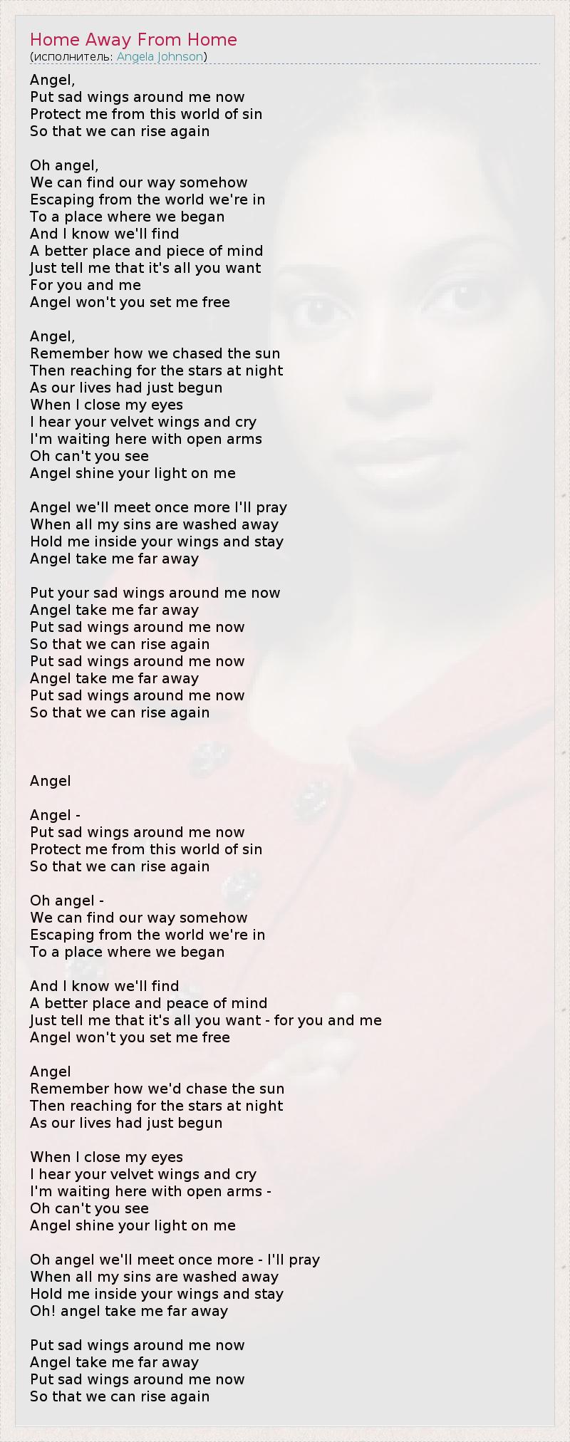 Ангел, Обними меня поникшими крыльями, Защити от грехов этого мира, Дабы мы воспарили опять. О, Ангел... Мы найдем свой путь во тьме. Покинем этот жалкий мир, В место, где наши души взяли начало. И я знаю, мы найдем Лучшее место, где мы найдем умиротворение. Скажи мне то, Что нам ничего не нужно больше. О, ангел, отпустишь ли ты меня? Ангел, Ты помнишь, как мы двигались к солнцу? Потом наблюдали звезда в ночи. Мы ведь только начинали жить... Когда я опускаю свои веки, Я слышу шум бархатных крыльев... И плачу. Я раскрыл свои объятия, О, почему же ты не видишь меня? Ангел, озари меня своим сиянием. Ангел, я буду молиться, дабы мы встретились вновь. Когда я очищусь от этих грехов, Обними меня своими крыльями и останься, Ангел, унеси меня далеко. Обними меня своими поникшими крыльями, Ангел, унеси меня далеко. Обними меня поникшими крыльями, Дабы мы воспарили опять. Обними меня поникшими крыльями, Ангел, унеси меня далеко. Обними меня поникшими крыльями, Дабы мы воспарили опять. Ангел* (перевод Дмитрий Гаргай из Красноармейска) Ангел, Крыльями укрой меня. Избавь от зла и от греха. И взлетим мы в небеса. О, Ангел, Сможем ли мы путь найти? Весь Мир оставить позади. Чтоб Жить Заново Смогли. Знаю мы найдём. Тот рай, что мне казался сном. Скажи мне чего хочешь ты для нас двоих. Или сразу отпусти.... Ангел, Ты помнишь звёзд сияние. Мечтали мы рукой достать. И Жизнь заново начать. И закрыв глаза Я слышу Ты зовёшь меня. Я здесь и я готов идти. В тёмной ночи. Ангел путь мне просвети. Я буду Всех святых молить, Чтобы простили мне грехи. Ну а Ты, Ангел, будь со мной. Унеси Меня С собой. Крыльями укрой меня, Вдаль отсюда забери. Крыльями укрой меня И взлетим мы в небеса. * поэтический перевод с элементами творческой интерпретации