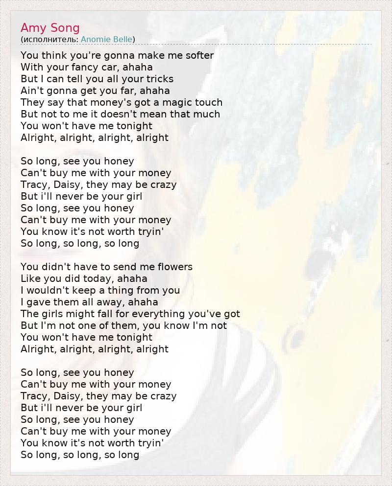 You think you're gonna make me softer With your fancy car, ahaha But I can tell you all your tricks Ain't gonna get you far, ahaha They say that money's got a magic touch But not to me it doesn't mean that much You won't have me tonight Alright, alright, alright, alright So long, see you honey Can't buy me with your money Tracy, Daisy, they may be crazy But i'll never be your girl So long, see you honey Can't buy me with your money You know it's not worth tryin' So long, so long, so long You didn't have to send me flowers Like you did today, ahaha I wouldn't keep a thing from you I gave them all away, ahaha The girls might fall for everything you've got But I'm not one of them, you know I'm not You won't have me tonight Alright, alright, alright, alright So long, see you honey Can't buy me with your money Tracy, Daisy, they may be crazy But i'll never be your girl So long, see you honey Can't buy me with your money You know it's not worth tryin' So long, so long, so long