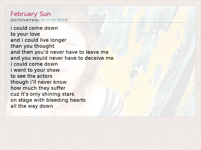 i could come down to your love and i could live longer than you thought and then you'd never have to leave me and you would never have to deceive me i could come down i went to your show to see the actors though i'll never know how much they suffer cuz it's only shining stars on stage with bleeding hearts all the way down