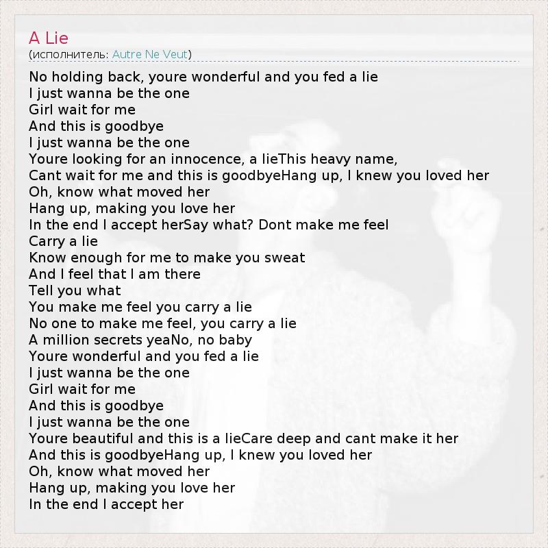 No holding back, youre wonderful and you fed a lie I just wanna be the one Girl wait for me And this is goodbye I just wanna be the one Youre looking for an innocence, a lieThis heavy name, Cant wait for me and this is goodbyeHang up, I knew you loved her Oh, know what moved her Hang up, making you love her In the end I accept herSay what? Dont make me feel Carry a lie Know enough for me to make you sweat And I feel that I am there Tell you what You make me feel you carry a lie No one to make me feel, you carry a lie A million secrets yeaNo, no baby Youre wonderful and you fed a lie I just wanna be the one Girl wait for me And this is goodbye I just wanna be the one Youre beautiful and this is a lieCare deep and cant make it her And this is goodbyeHang up, I knew you loved her Oh, know what moved her Hang up, making you love her In the end I accept her