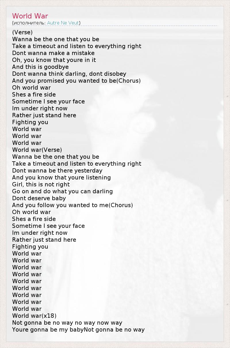 (Verse) Wanna be the one that you be Take a timeout and listen to everything right Dont wanna make a mistake Oh, you know that youre in it And this is goodbye Dont wanna think darling, dont disobey And you promised you wanted to be(Chorus) Oh world war Shes a fire side Sometime I see your face Im under right now Rather just stand here Fighting you World war World war World war World war(Verse) Wanna be the one that you be Take a timeout and listen to everything right Dont wanna be there yesterday And you know that youre listening Girl, this is not right Go on and do what you can darling Dont deserve baby And you follow you wanted to me(Chorus) Oh world war Shes a fire side Sometime I see your face Im under right now Rather just stand here Fighting you World war World war World war World war World war World war World war World war World war World war(x18) Not gonna be no way no way now way Youre gonna be my babyNot gonna be no way