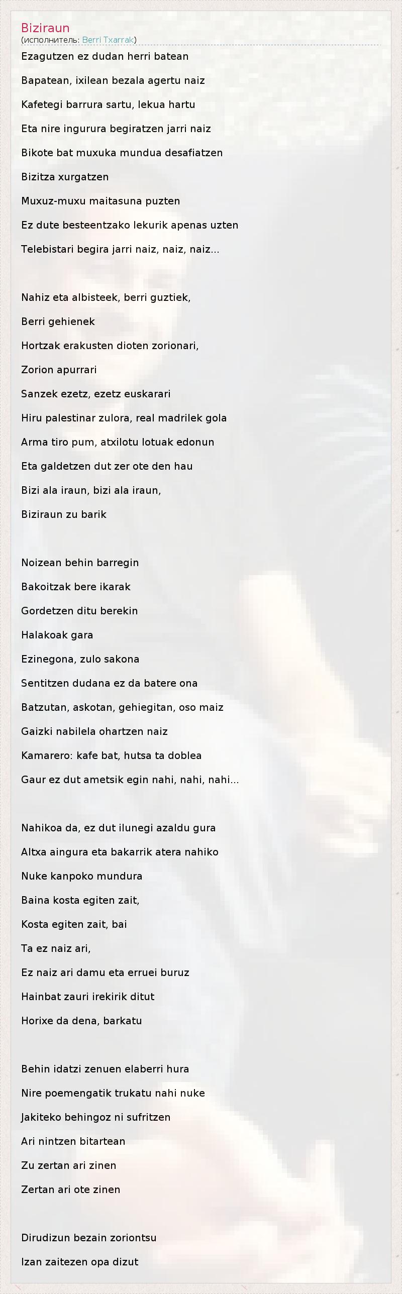 Ezagutzen ez dudan herri batean Bapatean, ixilean bezala agertu naiz Kafetegi barrura sartu, lekua hartu Eta nire ingurura begiratzen jarri naiz Bikote bat muxuka mundua desafiatzen Bizitza xurgatzen Muxuz-muxu maitasuna puzten Ez dute besteentzako lekurik apenas uzten Telebistari begira jarri naiz, naiz, naiz... Nahiz eta albisteek, berri guztiek, Berri gehienek Hortzak erakusten dioten zorionari, Zorion apurrari Sanzek ezetz, ezetz euskarari Hiru palestinar zulora, real madrilek gola Arma tiro pum, atxilotu lotuak edonun Eta galdetzen dut zer ote den hau Bizi ala iraun, bizi ala iraun, Biziraun zu barik Noizean behin barregin Bakoitzak bere ikarak Gordetzen ditu berekin Halakoak gara Ezinegona, zulo sakona Sentitzen dudana ez da batere ona Batzutan, askotan, gehiegitan, oso maiz Gaizki nabilela ohartzen naiz Kamarero: kafe bat, hutsa ta doblea Gaur ez dut ametsik egin nahi, nahi, nahi... Nahikoa da, ez dut ilunegi azaldu gura Altxa aingura eta bakarrik atera nahiko Nuke kanpoko mundura Baina kosta egiten zait, Kosta egiten zait, bai Ta ez naiz ari, Ez naiz ari damu eta erruei buruz Hainbat zauri irekirik ditut Horixe da dena, barkatu Behin idatzi zenuen elaberri hura Nire poemengatik trukatu nahi nuke Jakiteko behingoz ni sufritzen Ari nintzen bitartean Zu zertan ari zinen Zertan ari ote zinen Dirudizun bezain zoriontsu Izan zaitezen opa dizut