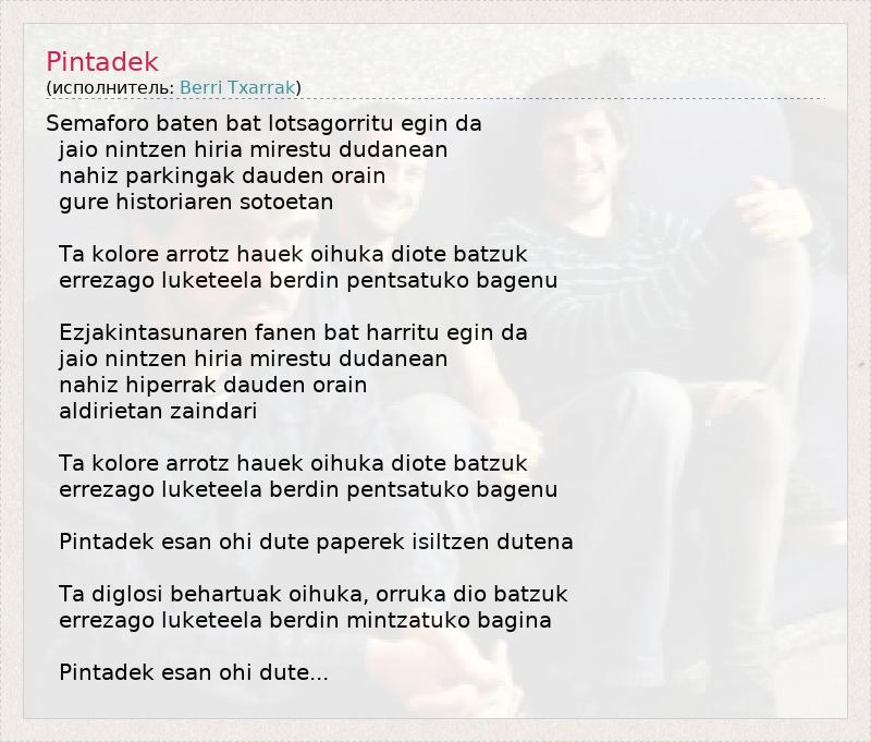 Semaforo baten bat lotsagorritu egin da jaio nintzen hiria mirestu dudanean nahiz parkingak dauden orain gure historiaren sotoetan Ta kolore arrotz hauek oihuka diote batzuk errezago luketeela berdin pentsatuko bagenu Ezjakintasunaren fanen bat harritu egin da jaio nintzen hiria mirestu dudanean nahiz hiperrak dauden orain aldirietan zaindari Ta kolore arrotz hauek oihuka diote batzuk errezago luketeela berdin pentsatuko bagenu Pintadek esan ohi dute paperek isiltzen dutena Ta diglosi behartuak oihuka, orruka dio batzuk errezago luketeela berdin mintzatuko bagina Pintadek esan ohi dute...