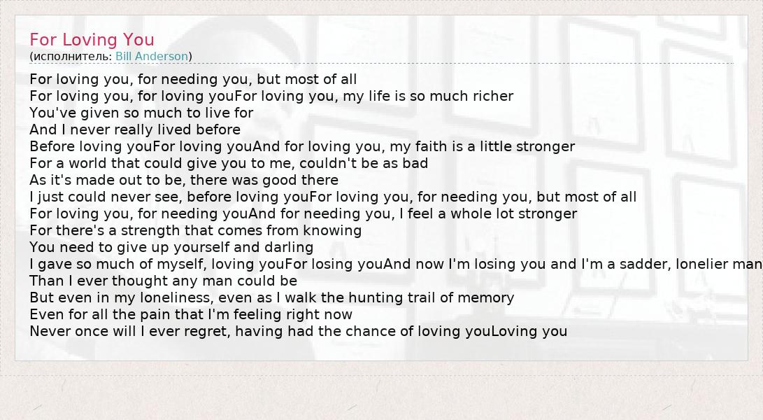 For loving you, for needing you, but most of all For loving you, for loving youFor loving you, my life is so much richer You've given so much to live for And I never really lived before Before loving youFor loving youAnd for loving you, my faith is a little stronger For a world that could give you to me, couldn't be as bad As it's made out to be, there was good there I just could never see, before loving youFor loving you, for needing you, but most of all For loving you, for needing youAnd for needing you, I feel a whole lot stronger For there's a strength that comes from knowing You need to give up yourself and darling I gave so much of myself, loving youFor losing youAnd now I'm losing you and I'm a sadder, lonelier man Than I ever thought any man could be But even in my loneliness, even as I walk the hunting trail of memory Even for all the pain that I'm feeling right now Never once will I ever regret, having had the chance of loving youLoving you