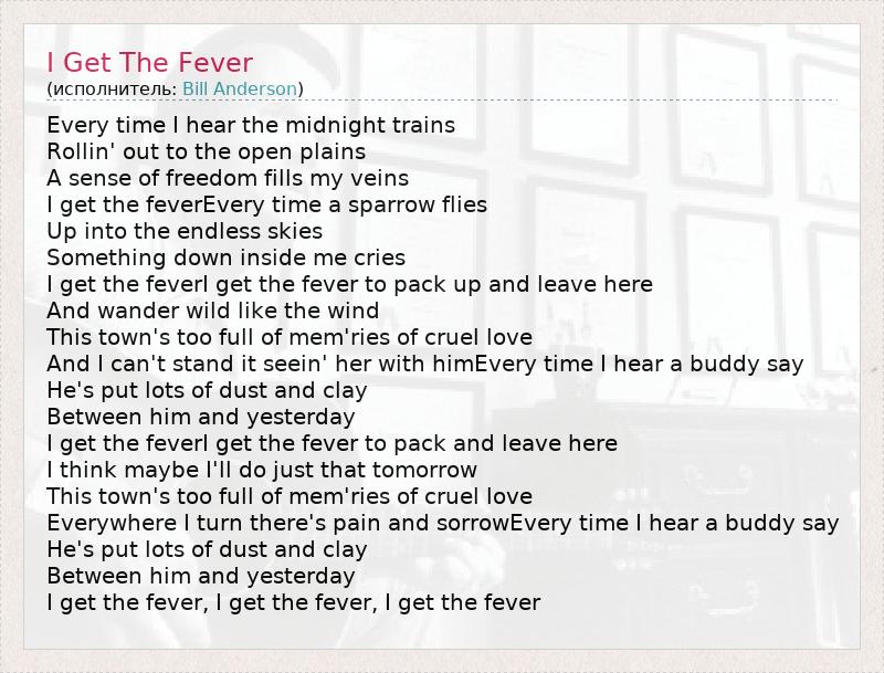 Every time I hear the midnight trains Rollin' out to the open plains A sense of freedom fills my veins I get the feverEvery time a sparrow flies Up into the endless skies Something down inside me cries I get the feverI get the fever to pack up and leave here And wander wild like the wind This town's too full of mem'ries of cruel love And I can't stand it seein' her with himEvery time I hear a buddy say He's put lots of dust and clay Between him and yesterday I get the feverI get the fever to pack and leave here I think maybe I'll do just that tomorrow This town's too full of mem'ries of cruel love Everywhere I turn there's pain and sorrowEvery time I hear a buddy say He's put lots of dust and clay Between him and yesterday I get the fever, I get the fever, I get the fever
