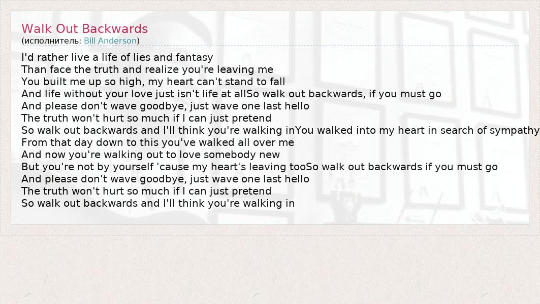 I'd rather live a life of lies and fantasy Than face the truth and realize you're leaving me You built me up so high, my heart can't stand to fall And life without your love just isn't life at allSo walk out backwards, if you must go And please don't wave goodbye, just wave one last hello The truth won't hurt so much if I can just pretend So walk out backwards and I'll think you're walking inYou walked into my heart in search of sympathy From that day down to this you've walked all over me And now you're walking out to love somebody new But you're not by yourself 'cause my heart's leaving tooSo walk out backwards if you must go And please don't wave goodbye, just wave one last hello The truth won't hurt so much if I can just pretend So walk out backwards and I'll think you're walking in