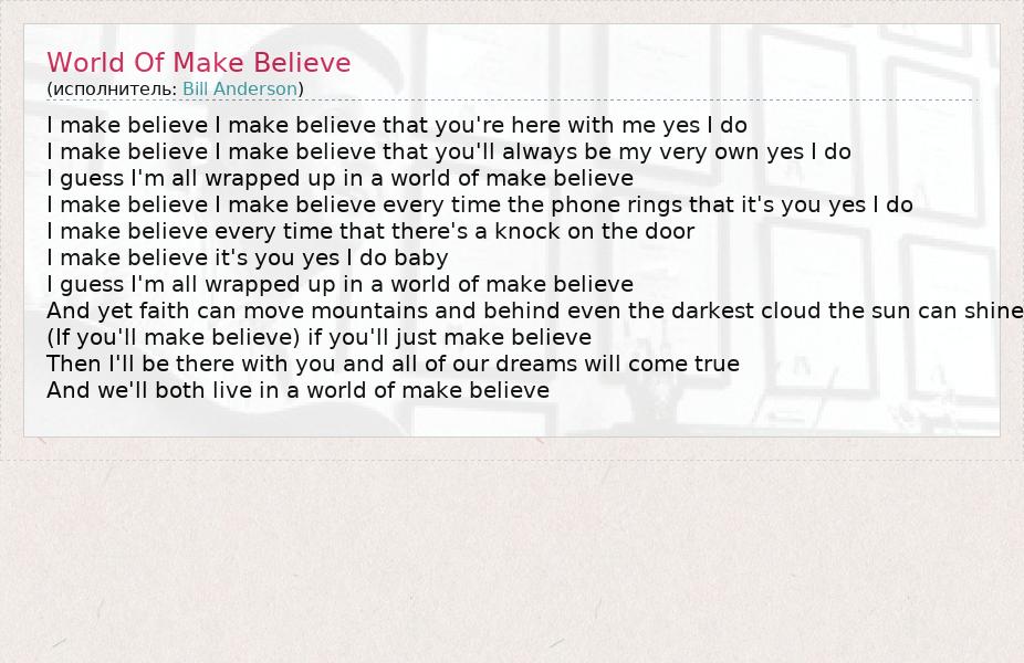 I make believe I make believe that you're here with me yes I do I make believe I make believe that you'll always be my very own yes I do I guess I'm all wrapped up in a world of make believe I make believe I make believe every time the phone rings that it's you yes I do I make believe every time that there's a knock on the door I make believe it's you yes I do baby I guess I'm all wrapped up in a world of make believe And yet faith can move mountains and behind even the darkest cloud the sun can shine (If you'll make believe) if you'll just make believe Then I'll be there with you and all of our dreams will come true And we'll both live in a world of make believe