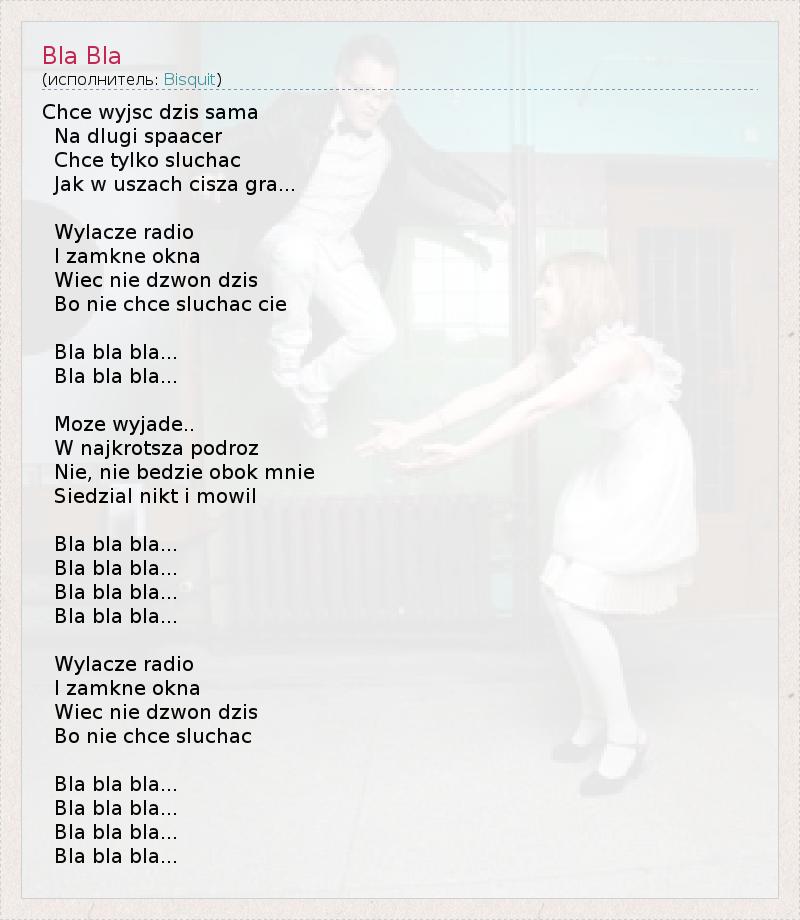 Chce wyjsc dzis sama Na dlugi spaacer Chce tylko sluchac Jak w uszach cisza gra... Wylacze radio I zamkne okna Wiec nie dzwon dzis Bo nie chce sluchac cie Bla bla bla... Bla bla bla... Moze wyjade.. W najkrotsza podroz Nie, nie bedzie obok mnie Siedzial nikt i mowil Bla bla bla... Bla bla bla... Bla bla bla... Bla bla bla... Wylacze radio I zamkne okna Wiec nie dzwon dzis Bo nie chce sluchac Bla bla bla... Bla bla bla... Bla bla bla... Bla bla bla...