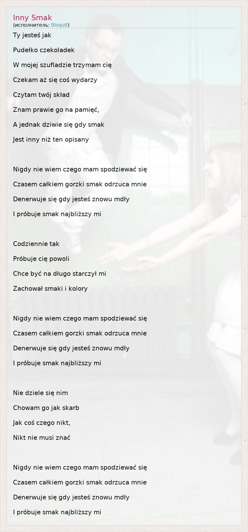 Ty jesteś jak Pudełko czekoladek W mojej szufladzie trzymam cię Czekam aż się coś wydarzy Czytam twój skład Znam prawie go na pamięć, A jednak dziwie się gdy smak Jest inny niż ten opisany Nigdy nie wiem czego mam spodziewać się Czasem całkiem gorzki smak odrzuca mnie Denerwuje się gdy jesteś znowu mdły I próbuje smak najbliższy mi Codziennie tak Próbuje cię powoli Chce być na długo starczył mi Zachował smaki i kolory Nigdy nie wiem czego mam spodziewać się Czasem całkiem gorzki smak odrzuca mnie Denerwuje się gdy jesteś znowu mdły I próbuje smak najbliższy mi Nie dziele się nim Chowam go jak skarb Jak coś czego nikt, Nikt nie musi znać Nigdy nie wiem czego mam spodziewać się Czasem całkiem gorzki smak odrzuca mnie Denerwuje się gdy jesteś znowu mdły I próbuje smak najbliższy mi