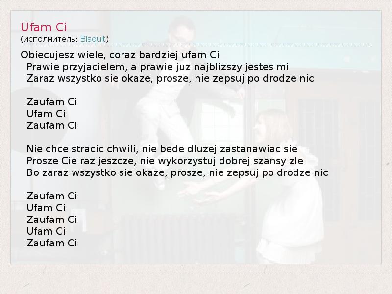 Obiecujesz wiele, coraz bardziej ufam Ci Prawie przyjacielem, a prawie juz najblizszy jestes mi Zaraz wszystko sie okaze, prosze, nie zepsuj po drodze nic Zaufam Ci Ufam Ci Zaufam Ci Nie chce stracic chwili, nie bede dluzej zastanawiac sie Prosze Cie raz jeszcze, nie wykorzystuj dobrej szansy zle Bo zaraz wszystko sie okaze, prosze, nie zepsuj po drodze nic Zaufam Ci Ufam Ci Zaufam Ci Ufam Ci Zaufam Ci
