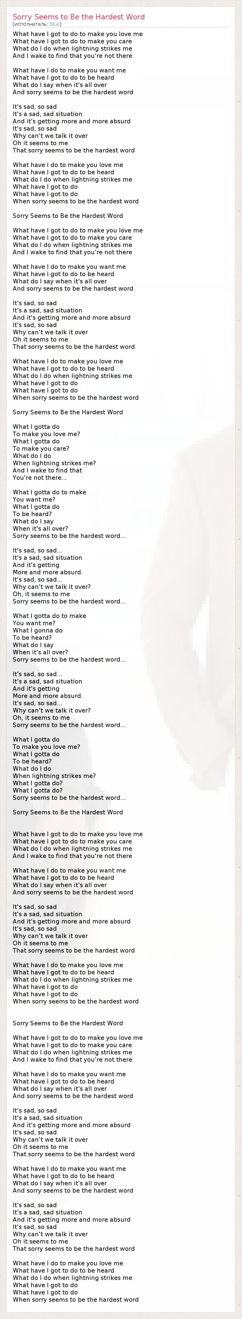 What have I got to do to make you love me What have I got to do to make you care What do I do when lightning strikes me And I wake to find that you're not there What have I do to make you want me What have I got to do to be heard What do I say when it's all over And sorry seems to be the hardest word It's sad, so sad It's a sad, sad situation And it's getting more and more absurd It's sad, so sad Why can't we talk it over Oh it seems to me That sorry seems to be the hardest word What have I do to make you love me What have I got to do to be heard What do I do when lightning strikes me What have I got to do What have I got to do When sorry seems to be the hardest word Sorry Seems to Be the Hardest Word What have I got to do to make you love me What have I got to do to make you care What do I do when lightning strikes me And I wake to find that you're not there What have I do to make you want me What have I got to do to be heard What do I say when it's all over And sorry seems to be the hardest word It's sad, so sad It's a sad, sad situation And it's getting more and more absurd It's sad, so sad Why can't we talk it over Oh it seems to me That sorry seems to be the hardest word What have I do to make you love me What have I got to do to be heard What do I do when lightning strikes me What have I got to do What have I got to do When sorry seems to be the hardest word Sorry Seems to Be the Hardest Word What I gotta do To make you love me? What I gotta do To make you care? What do I do When lightning strikes me? And I wake to find that You're not there... What I gotta do to make You want me? What I gotta do To be heard? What do I say When it's all over? Sorry seems to be the hardest word... It's sad, so sad... It's a sad, sad situation And it's getting More and more absurd. It's sad, so sad... Why can't we talk it over? Oh, it seems to me Sorry seems to be the hardest word... What I gotta do to make You want me? What I gonna do To be heard? What do I say When it's all over? Sorry seems to be the hardest word... It's sad, so sad... It's a sad, sad situation And it's getting More and more absurd. It's sad, so sad... Why can't we talk it over? Oh, it seems to me Sorry seems to be the hardest word... What I gotta do To make you love me? What I gotta do To be heard? What do I do When lightning strikes me? What I gotta do? What I gotta do? Sorry seems to be the hardest word... Sorry Seems to Be the Hardest Word What have I got to do to make you love me What have I got to do to make you care What do I do when lightning strikes me And I wake to find that you're not there What have I do to make you want me What have I got to do to be heard What do I say when it's all over And sorry seems to be the hardest word It's sad, so sad It's a sad, sad situation And it's getting more and more absurd It's sad, so sad Why can't we talk it over Oh it seems to me That sorry seems to be the hardest word What have I do to make you love me What have I got to do to be heard What do I do when lightning strikes me What have I got to do What have I got to do When sorry seems to be the hardest word Sorry Seems to Be the Hardest Word What have I got to do to make you love me What have I got to do to make you care What do I do when lightning strikes me And I wake to find that you're not there What have I do to make you want me What have I got to do to be heard What do I say when it's all over And sorry seems to be the hardest word It's sad, so sad It's a sad, sad situation And it's getting more and more absurd It's sad, so sad Why can't we talk it over Oh it seems to me That sorry seems to be the hardest word What have I do to make you want me What have I got to do to be heard What do I say when it's all over And sorry seems to be the hardest word It's sad, so sad It's a sad, sad situation And it's getting more and more absurd It's sad, so sad Why can't we talk it over Oh it seems to me That sorry seems to be the hardest word What have I do to make you love me What have I got to do to be heard What do I do when lightning strikes me What have I got to do What have I got to do When sorry seems to be the hardest word
