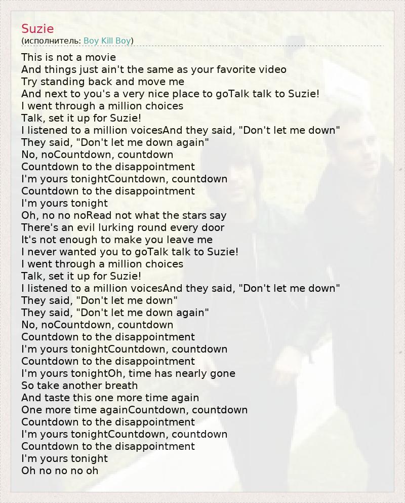 This is not a movie And things just ain't the same as your favorite video Try standing back and move me And next to you's a very nice place to goTalk talk to Suzie! I went through a million choices Talk, set it up for Suzie! I listened to a million voicesAnd they said, "Don't let me down" They said, "Don't let me down again" No, noCountdown, countdown Countdown to the disappointment I'm yours tonightCountdown, countdown Countdown to the disappointment I'm yours tonight Oh, no no noRead not what the stars say There's an evil lurking round every door It's not enough to make you leave me I never wanted you to goTalk talk to Suzie! I went through a million choices Talk, set it up for Suzie! I listened to a million voicesAnd they said, "Don't let me down" They said, "Don't let me down" They said, "Don't let me down again" No, noCountdown, countdown Countdown to the disappointment I'm yours tonightCountdown, countdown Countdown to the disappointment I'm yours tonightOh, time has nearly gone So take another breath And taste this one more time again One more time againCountdown, countdown Countdown to the disappointment I'm yours tonightCountdown, countdown Countdown to the disappointment I'm yours tonight Oh no no no oh