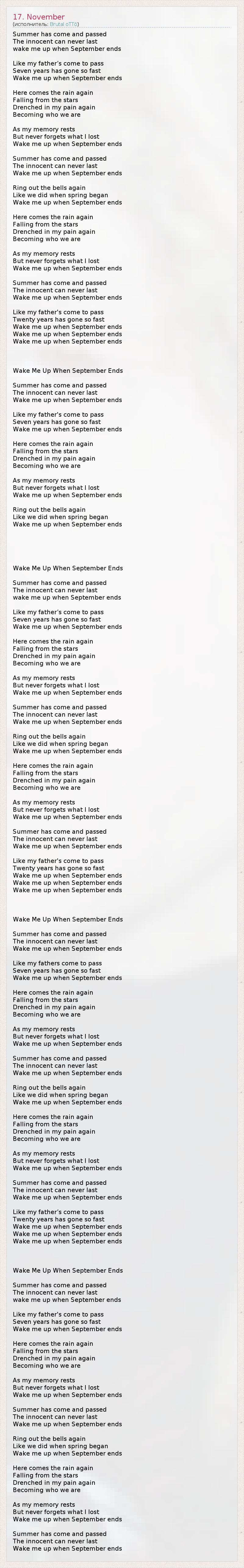 Summer has come and passed The innocent can never last wake me up when September ends Like my father’s come to pass Seven years has gone so fast Wake me up when September ends Here comes the rain again Falling from the stars Drenched in my pain again Becoming who we are As my memory rests But never forgets what I lost Wake me up when September ends Summer has come and passed The innocent can never last Wake me up when September ends Ring out the bells again Like we did when spring began Wake me up when September ends Here comes the rain again Falling from the stars Drenched in my pain again Becoming who we are As my memory rests But never forgets what I lost Wake me up when September ends Summer has come and passed The innocent can never last Wake me up when September ends Like my father's come to pass Twenty years has gone so fast Wake me up when September ends Wake me up when September ends Wake me up when September ends Wake Me Up When September Ends Summer has come and passed The innocent can never last Wake me up when September ends Like my father's come to pass Seven years has gone so fast Wake me up when September ends Here comes the rain again Falling from the stars Drenched in my pain again Becoming who we are As my memory rests But never forgets what I lost Wake me up when September ends Ring out the bells again Like we did when spring began Wake me up when September ends Wake Me Up When September Ends Summer has come and passed The innocent can never last wake me up when September ends Like my father’s come to pass Seven years has gone so fast Wake me up when September ends Here comes the rain again Falling from the stars Drenched in my pain again Becoming who we are As my memory rests But never forgets what I lost Wake me up when September ends Summer has come and passed The innocent can never last Wake me up when September ends Ring out the bells again Like we did when spring began Wake me up when September ends Here comes the rain again Falling from the stars Drenched in my pain again Becoming who we are As my memory rests But never forgets what I lost Wake me up when September ends Summer has come and passed The innocent can never last Wake me up when September ends Like my father's come to pass Twenty years has gone so fast Wake me up when September ends Wake me up when September ends Wake me up when September ends Wake Me Up When September Ends Summer has come and passed The innocent can never last Wake me up when September ends Like my fathers come to pass Seven years has gone so fast Wake me up when September ends Here comes the rain again Falling from the stars Drenched in my pain again Becoming who we are As my memory rests But never forgets what I lost Wake me up when September ends Summer has come and passed The innocent can never last Wake me up when September ends Ring out the bells again Like we did when spring began Wake me up when September ends Here comes the rain again Falling from the stars Drenched in my pain again Becoming who we are As my memory rests But never forgets what I lost Wake me up when September ends Summer has come and passed The innocent can never last Wake me up when September ends Like my father’s come to pass Twenty years has gone so fast Wake me up when September ends Wake me up when September ends Wake me up when September ends Wake Me Up When September Ends Summer has come and passed The innocent can never last wake me up when September ends Like my father's come to pass Seven years has gone so fast Wake me up when September ends Here comes the rain again Falling from the stars Drenched in my pain again Becoming who we are As my memory rests But never forgets what I lost Wake me up when September ends Summer has come and passed The innocent can never last Wake me up when September ends Ring out the bells again Like we did when spring began Wake me up when September ends Here comes the rain again Falling from the stars Drenched in my pain again Becoming who we are As my memory rests But never forgets what I lost Wake me up when September ends Summer has come and passed The innocent can never last Wake me up when September ends