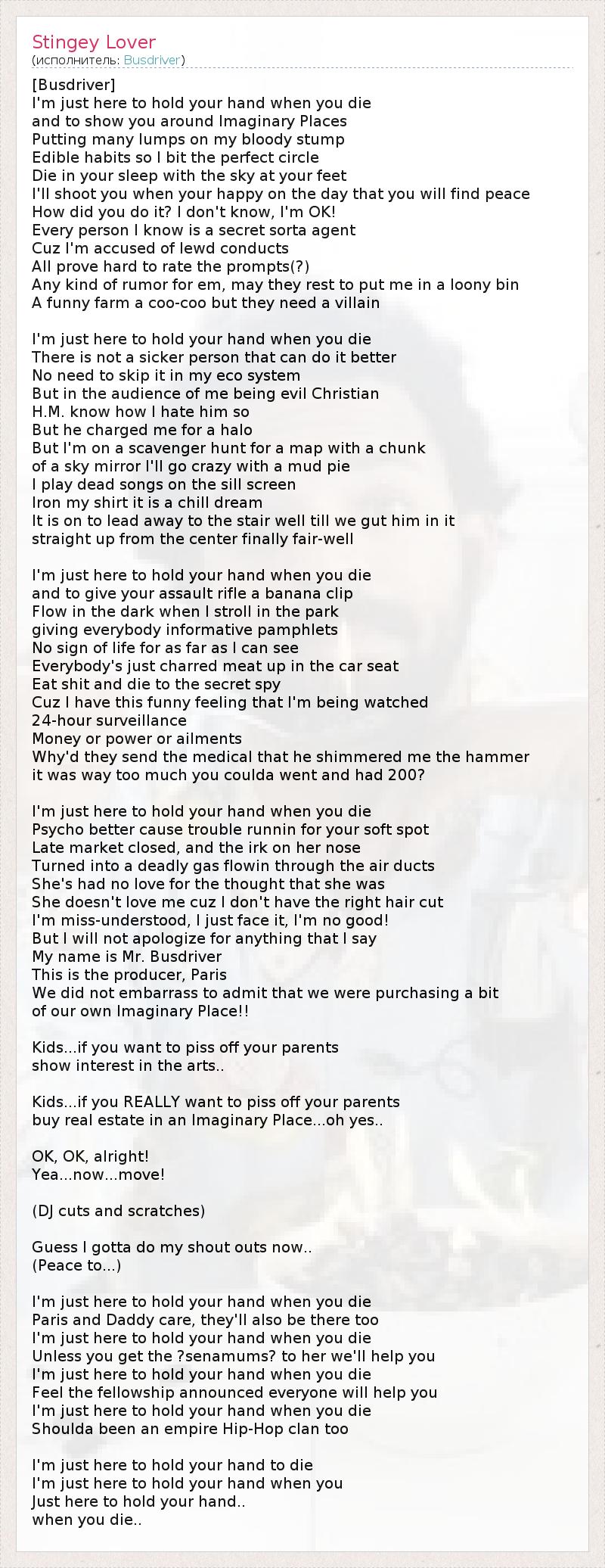 [Busdriver] I'm just here to hold your hand when you die and to show you around Imaginary Places Putting many lumps on my bloody stump Edible habits so I bit the perfect circle Die in your sleep with the sky at your feet I'll shoot you when your happy on the day that you will find peace How did you do it? I don't know, I'm OK! Every person I know is a secret sorta agent Cuz I'm accused of lewd conducts All prove hard to rate the prompts(?) Any kind of rumor for em, may they rest to put me in a loony bin A funny farm a coo-coo but they need a villain I'm just here to hold your hand when you die There is not a sicker person that can do it better No need to skip it in my eco system But in the audience of me being evil Christian H.M. know how I hate him so But he charged me for a halo But I'm on a scavenger hunt for a map with a chunk of a sky mirror I'll go crazy with a mud pie I play dead songs on the sill screen Iron my shirt it is a chill dream It is on to lead away to the stair well till we gut him in it straight up from the center finally fair-well I'm just here to hold your hand when you die and to give your assault rifle a banana clip Flow in the dark when I stroll in the park giving everybody informative pamphlets No sign of life for as far as I can see Everybody's just charred meat up in the car seat Eat shit and die to the secret spy Cuz I have this funny feeling that I'm being watched 24-hour surveillance Money or power or ailments Why'd they send the medical that he shimmered me the hammer it was way too much you coulda went and had 200? I'm just here to hold your hand when you die Psycho better cause trouble runnin for your soft spot Late market closed, and the irk on her nose Turned into a deadly gas flowin through the air ducts She's had no love for the thought that she was She doesn't love me cuz I don't have the right hair cut I'm miss-understood, I just face it, I'm no good! But I will not apologize for anything that I say My name is Mr. Busdriver This is the producer, Paris We did not embarrass to admit that we were purchasing a bit of our own Imaginary Place!! Kids...if you want to piss off your parents show interest in the arts.. Kids...if you REALLY want to piss off your parents buy real estate in an Imaginary Place...oh yes.. OK, OK, alright! Yea...now...move! (DJ cuts and scratches) Guess I gotta do my shout outs now.. (Peace to...) I'm just here to hold your hand when you die Paris and Daddy care, they'll also be there too I'm just here to hold your hand when you die Unless you get the ?senamums? to her we'll help you I'm just here to hold your hand when you die Feel the fellowship announced everyone will help you I'm just here to hold your hand when you die Shoulda been an empire Hip-Hop clan too I'm just here to hold your hand to die I'm just here to hold your hand when you Just here to hold your hand.. when you die..