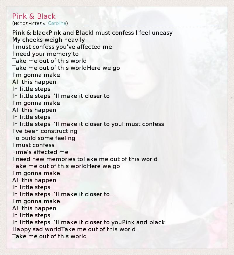 Pink & blackPink and BlackI must confess I feel uneasy My cheeks weigh heavily I must confess you've affected me I need your memory to Take me out of this world Take me out of this worldHere we go I'm gonna make All this happen In little steps In little steps I'll make it closer to I'm gonna make All this happen In little steps In little steps I'll make it closer to youI must confess I've been constructing To build some feeling I must confess Time's affected me I need new memories toTake me out of this world Take me out of this worldHere we go I'm gonna make All this happen In little steps In little steps i'll make it closer to... I'm gonna make All this happen In little steps In little steps i'll make it closer to youPink and black Happy sad worldTake me out of this world Take me out of this world