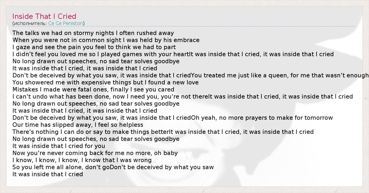 The talks we had on stormy nights I often rushed away When you were not in common sight I was held by his embrace I gaze and see the pain you feel to think we had to part I didn't feel you loved me so I played games with your heartIt was inside that I cried, it was inside that I cried No long drawn out speeches, no sad tear solves goodbye It was inside that I cried, it was inside that I cried Don't be deceived by what you saw, it was inside that I criedYou treated me just like a queen, for me that wasn't enough You showered me with expensive things but I found a new love Mistakes I made were fatal ones, finally I see you cared I can't undo what has been done, now I need you, you're not thereIt was inside that I cried, it was inside that I cried No long drawn out speeches, no sad tear solves goodbye It was inside that I cried, it was inside that I cried Don't be deceived by what you saw, it was inside that I criedOh yeah, no more prayers to make for tomorrow Our time has slipped away, I feel so helpless There's nothing I can do or say to make things betterIt was inside that I cried, it was inside that I cried No long drawn out speeches, no sad tear solves goodbye It was inside that I cried for you Now you're never coming back for me no more, oh baby I know, I know, I know, I know that I was wrong So you left me all alone, don't goDon't be deceived by what you saw It was inside that I cried